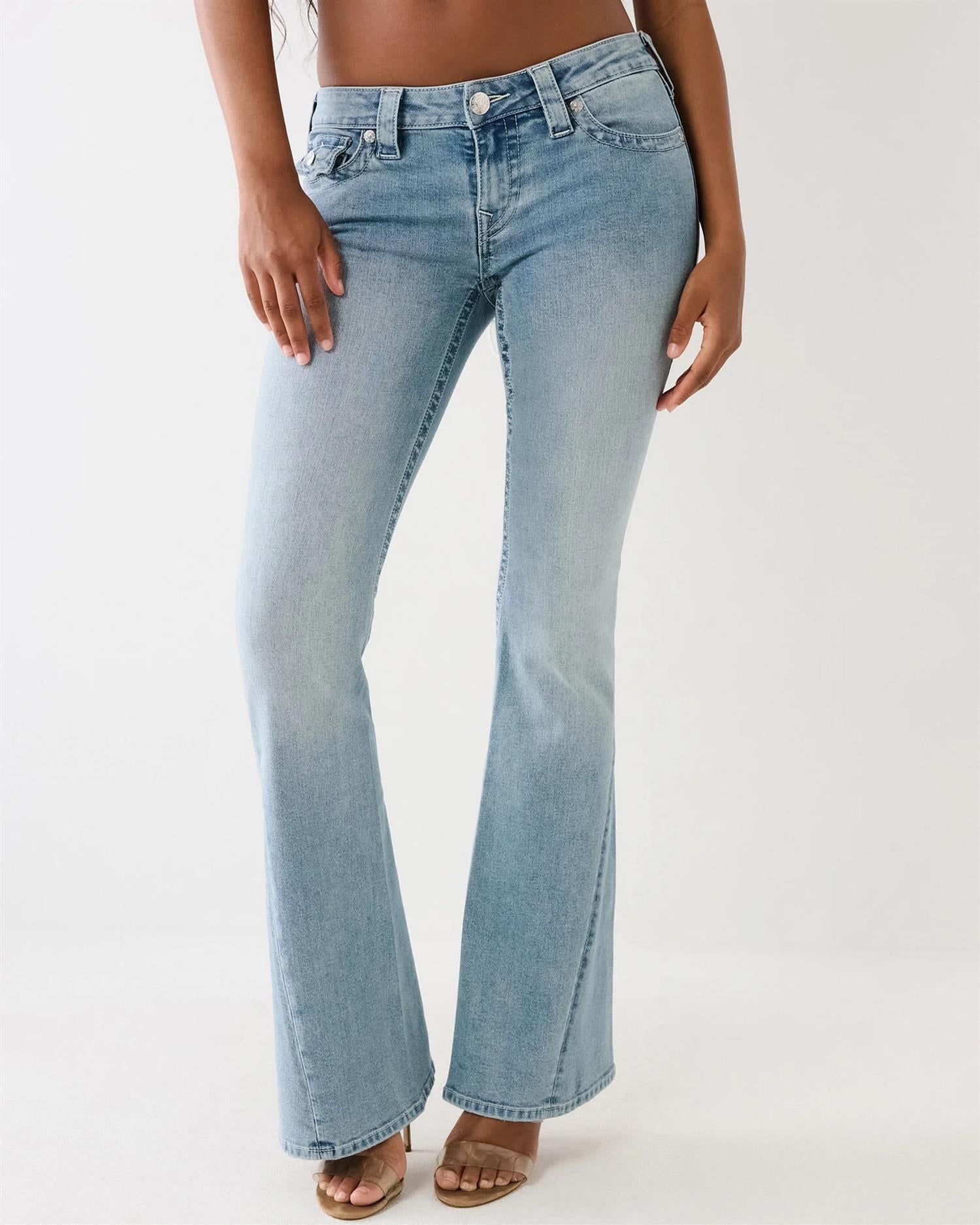 Joey Low Rise Flare fra True Religion. Joey Low Rise Flare er et statement-plagg som kombinerer retroinspirert stil med moderne detaljer. Jeansene har en lav midje, utsvingte ben og ikoniske klafflommer bak med hestesko-detaljer og sølvfarget hardware. Perfekt for både hverdagsbruk og mer pyntede anledninger. Normal i størrelsen.