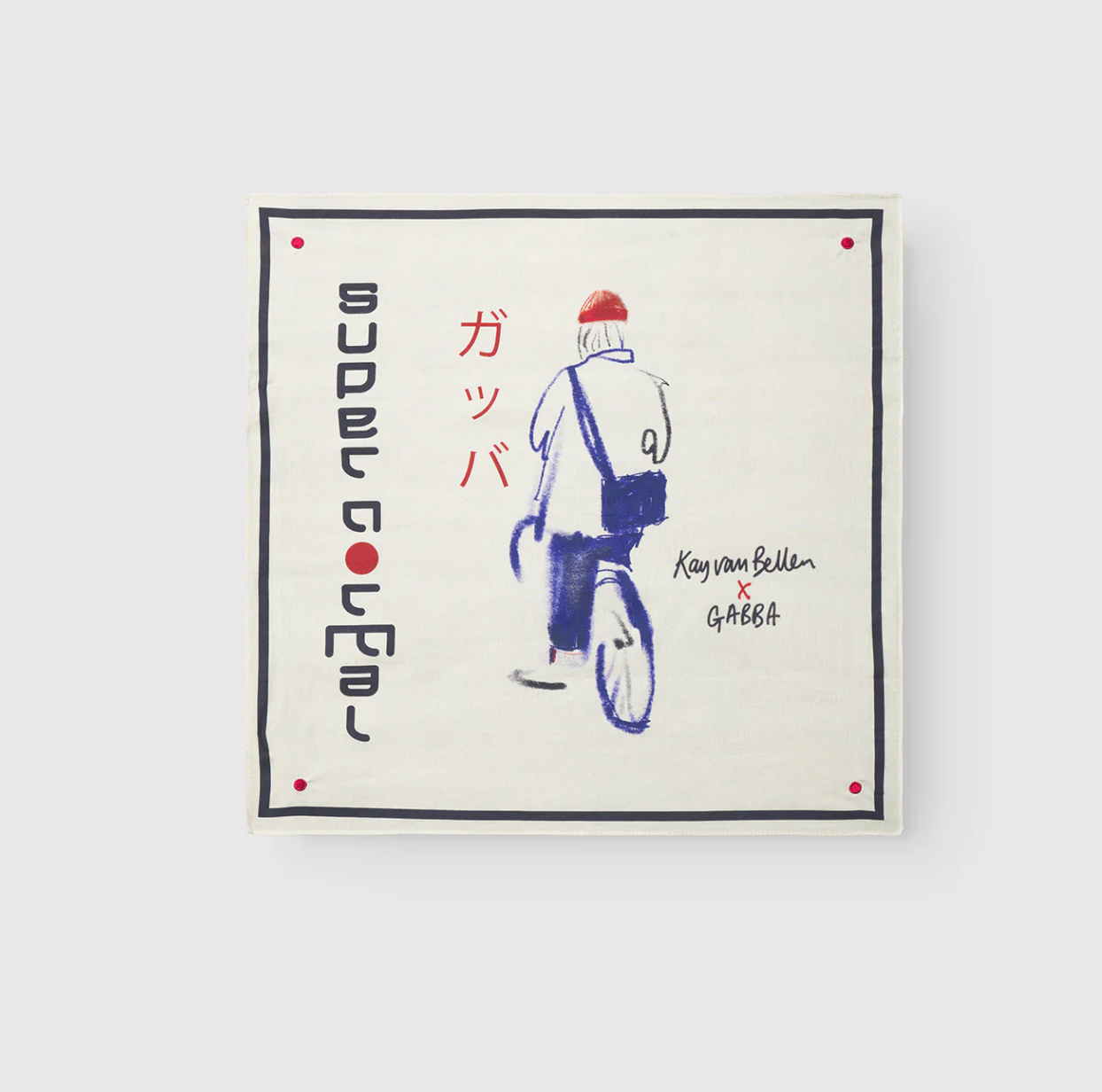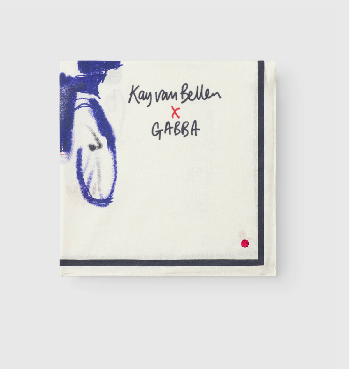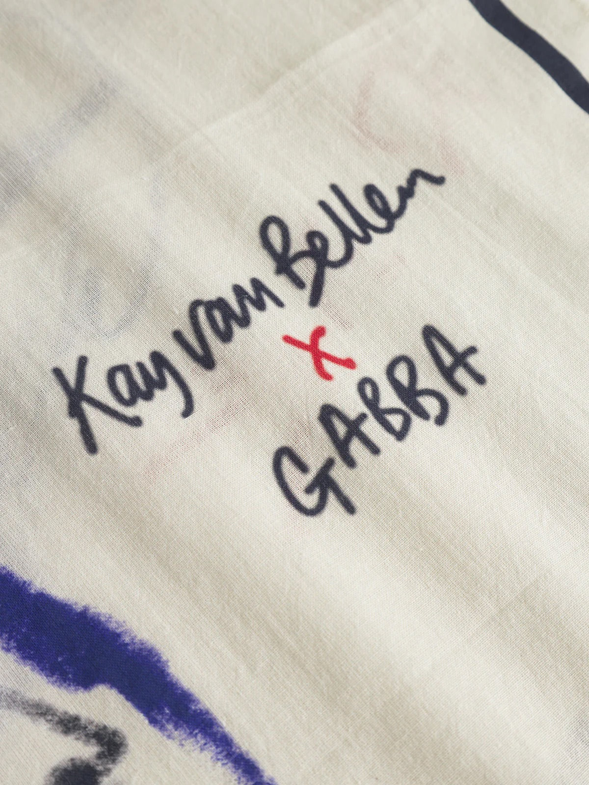 Bandana Kay fra Gabba. Bandana Kay er en del av samarbeidet mellom Kay van Bellen og Gabba, og viser et eksklusivt illustrert motiv. Med sitt unike, Japan-inspirerte mønster og produksjon i 100% bomull kombinerer dette tilbehøret funksjon og kunst på en lett og pustende måte, perfekt som et uttrykksfullt og anvendelig tilbehør. Onesize.