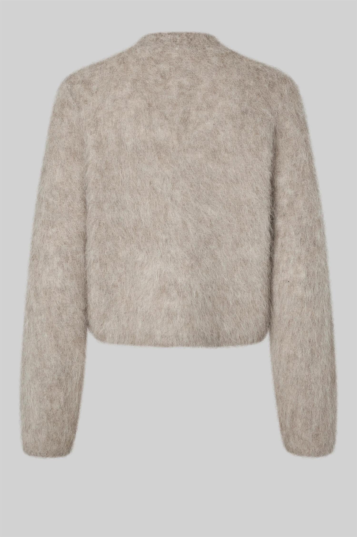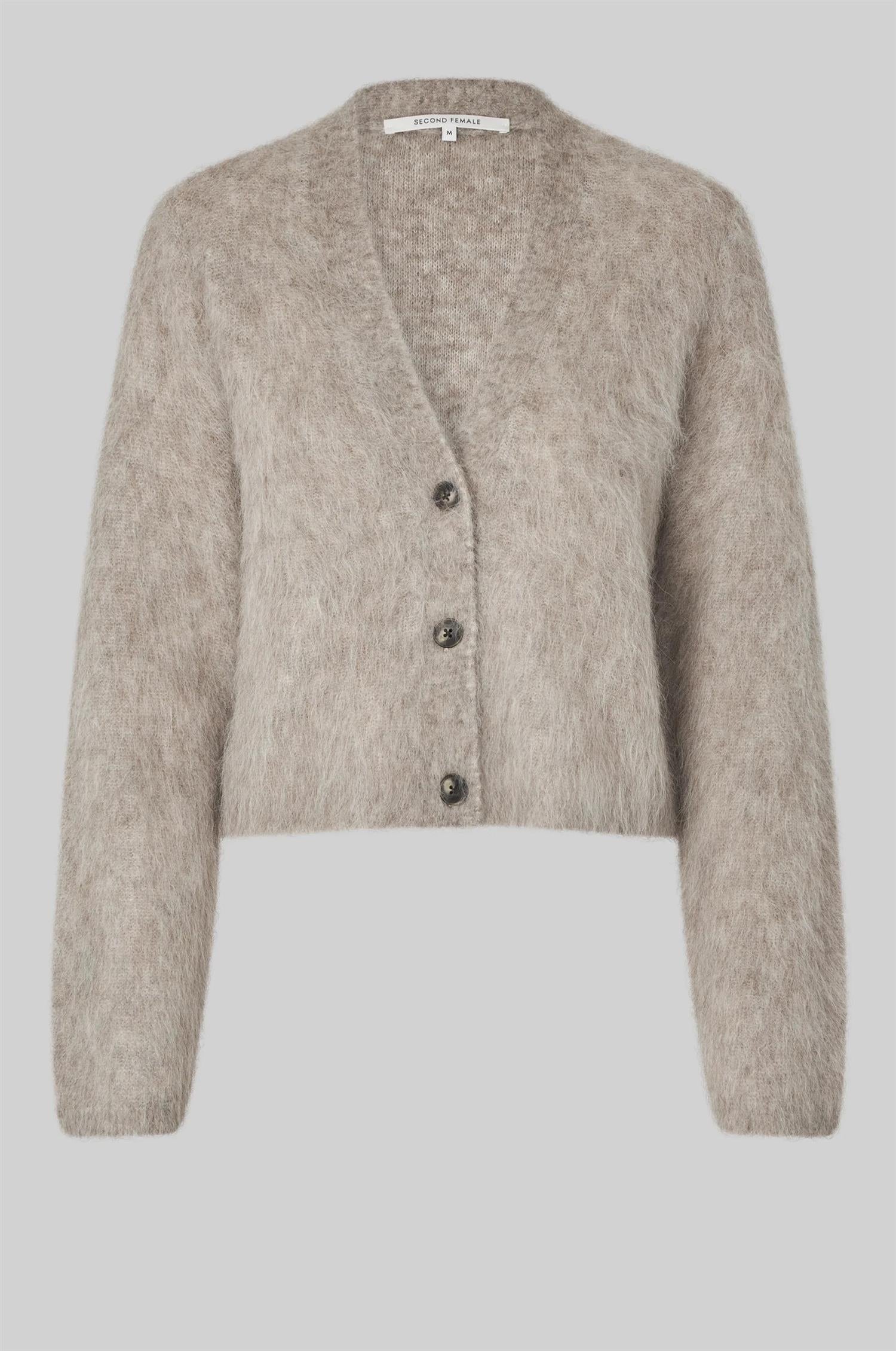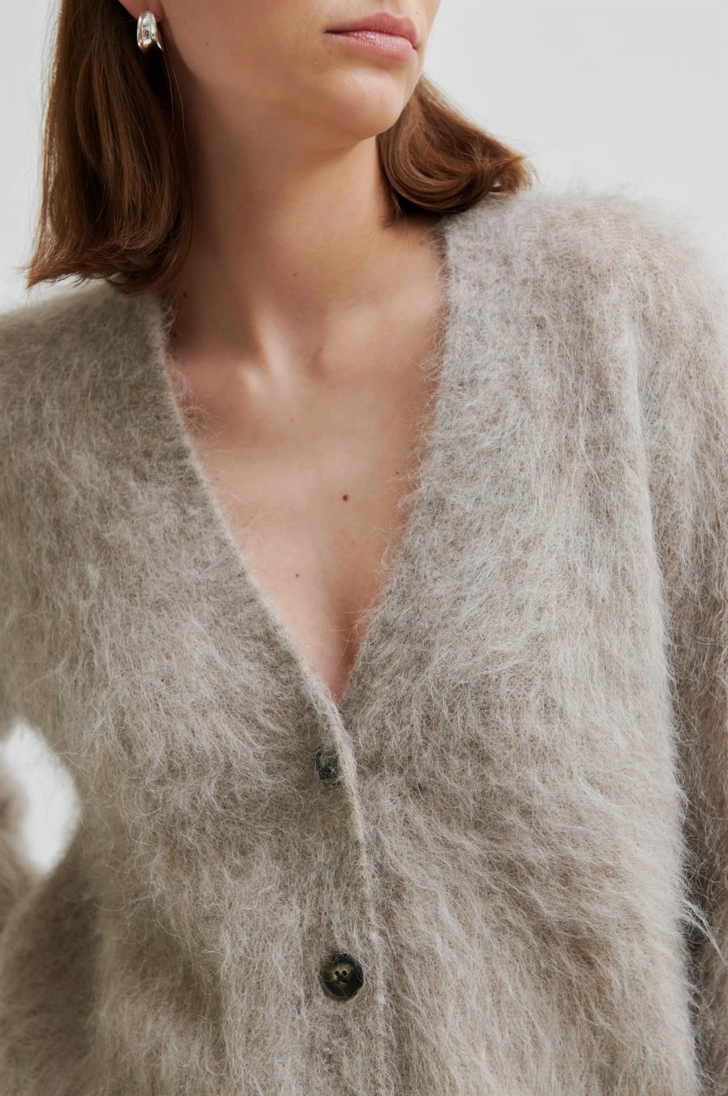 Karla Knit Cardigan fra Second Female. Karla Knit Cardigan er en myk og fluffy cardigan laget i en luksuriøs alpakka-blanding. Den har V-hals, knappelukking i front og lange ermer. Med sin regular, lett boxy passform gir den et avslappet, men elegant uttrykk – perfekt til både hverdags og jobb.