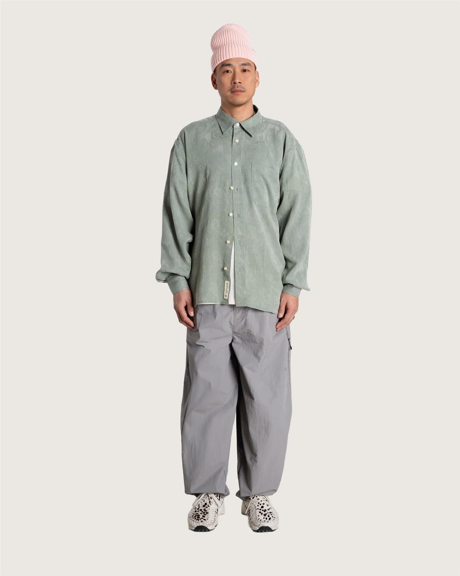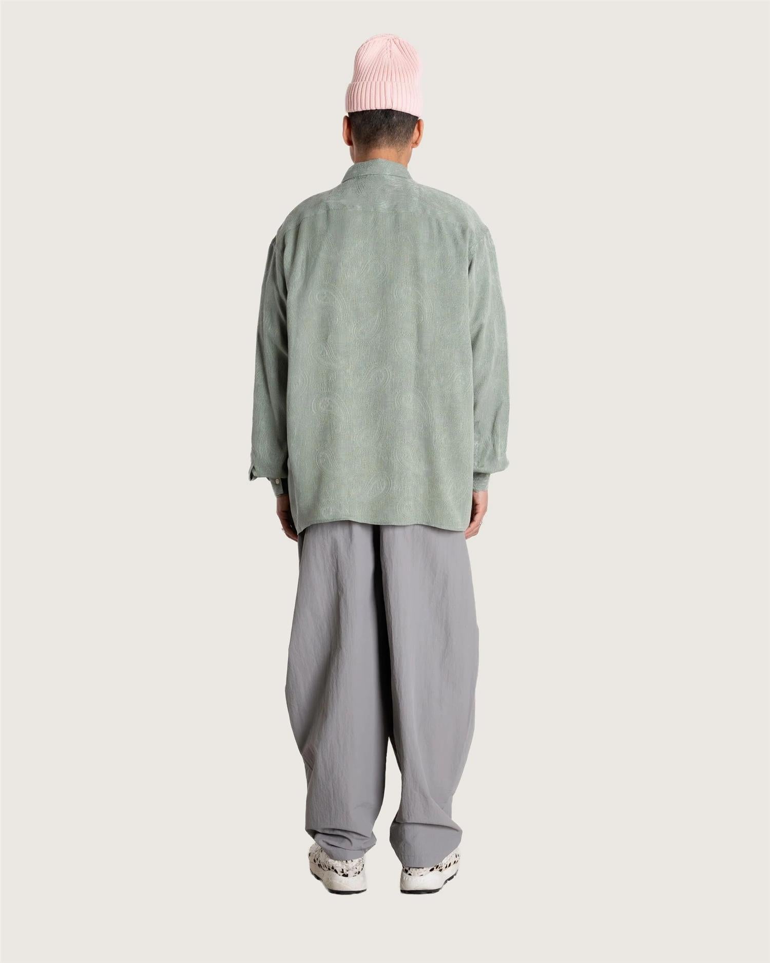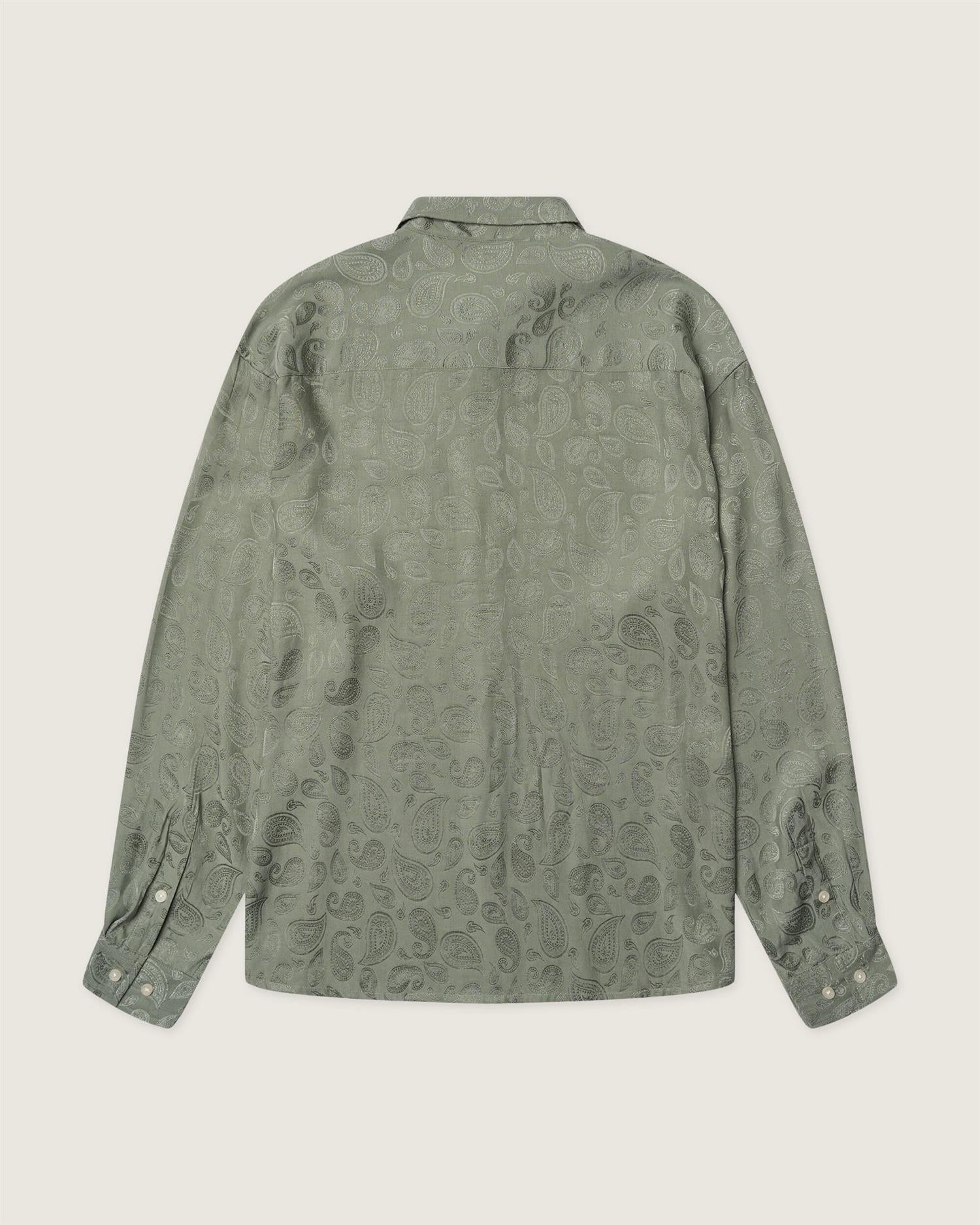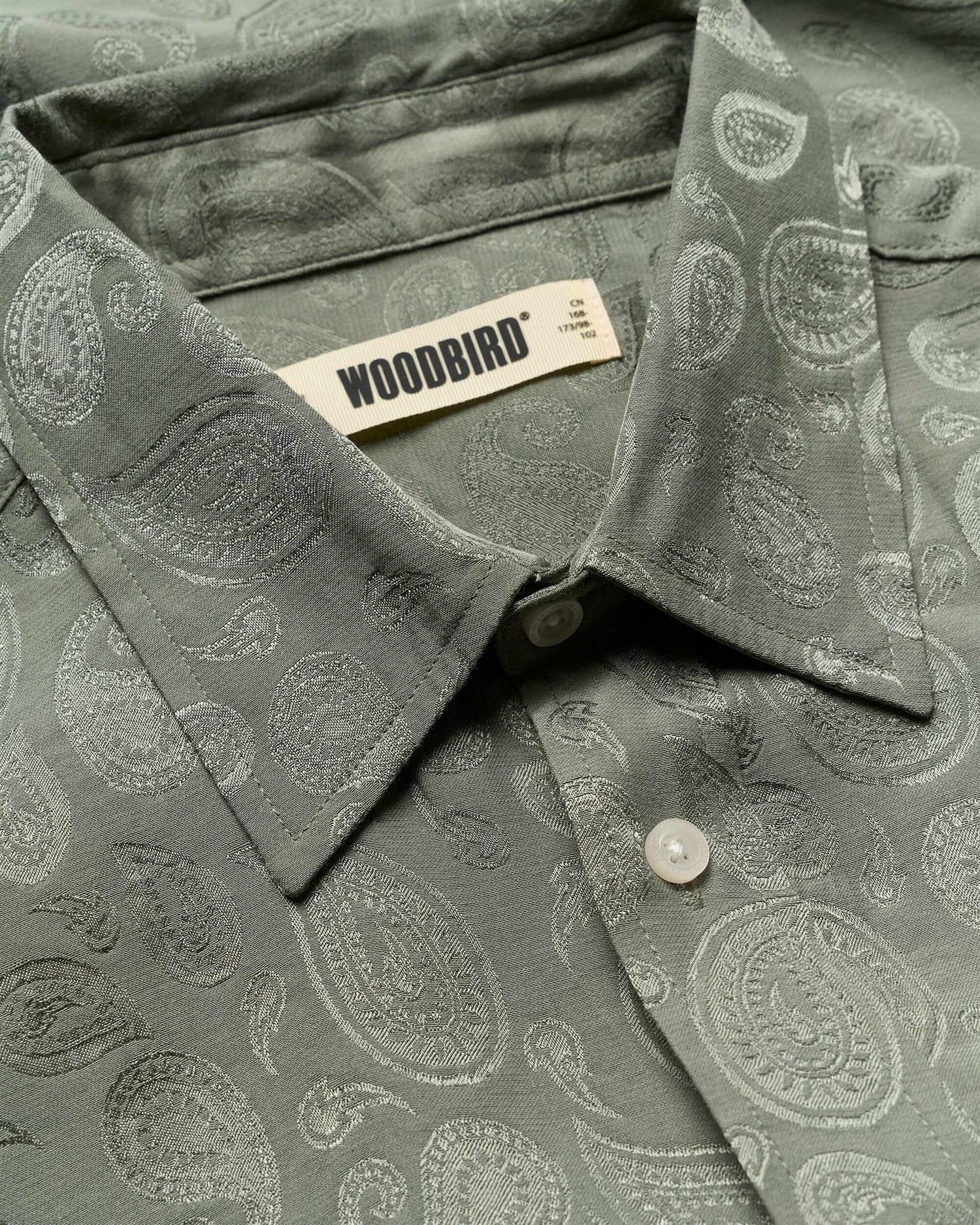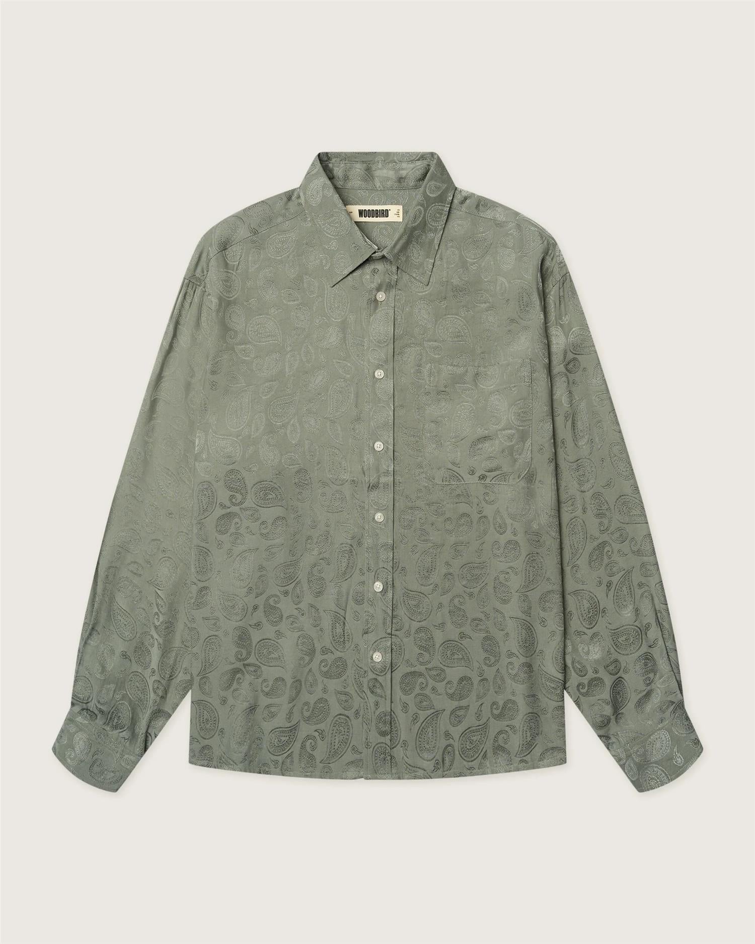 WoodbirdBuzo Paisley Shirt fra Woodbird. Buzo Paisley Shirt er en stilig skjorte med et tonalt paisleymønster vevd inn i en grågrønn base som gir tekstur og personlighet. Den er laget i en eksklusiv blanding av cupro og viskose, som gir et mykt, glatt stoff med en elegant glans. Skjorten har en klassisk spiss krage, glatte knapper og mansjetter med knappelukking. Det subtile paisleymønsteret gir et hint av mystikk og fungerer nærmest som kamuflasje i dempet belysning – perfekt for kvelder ute. Normal i størrelsen.