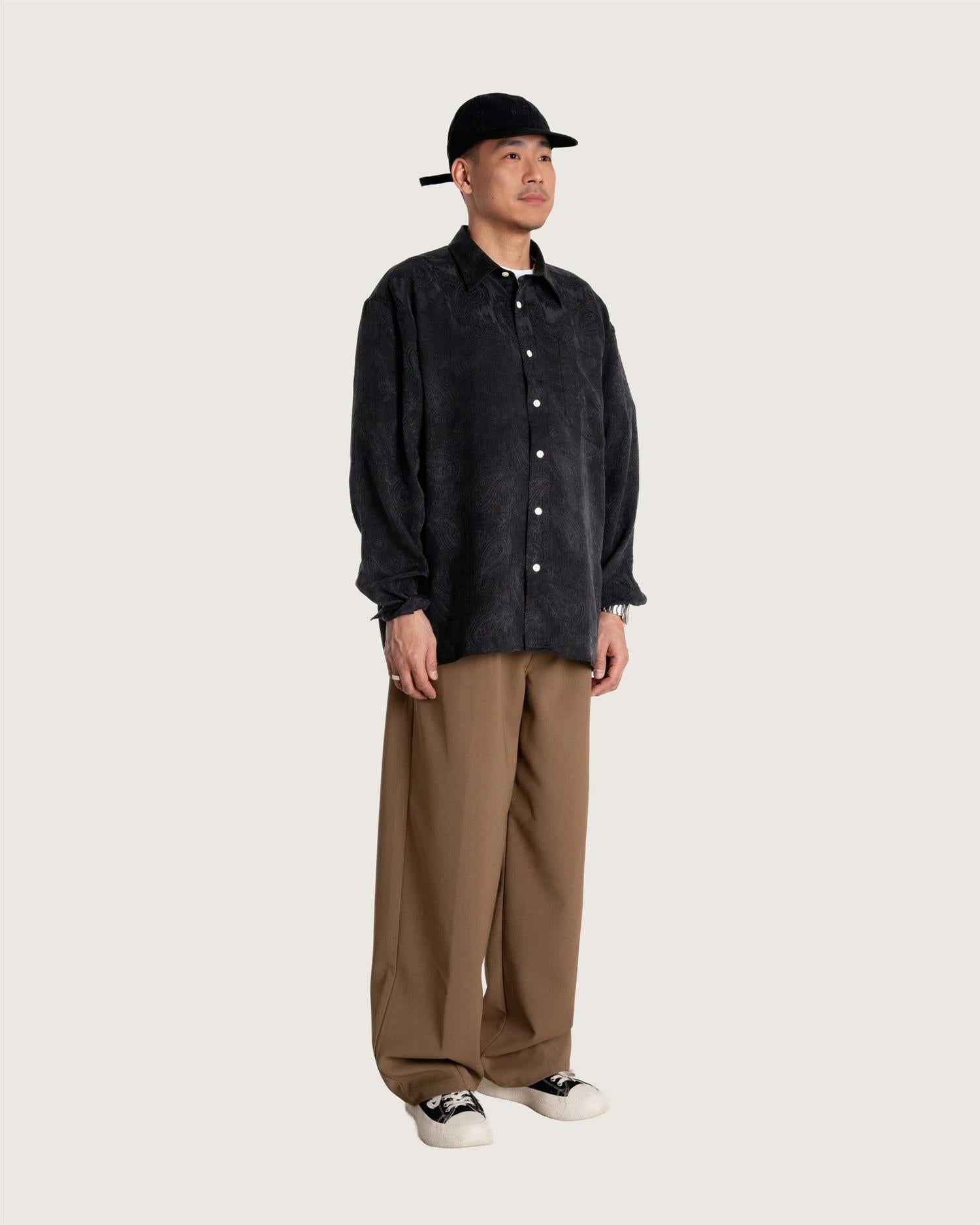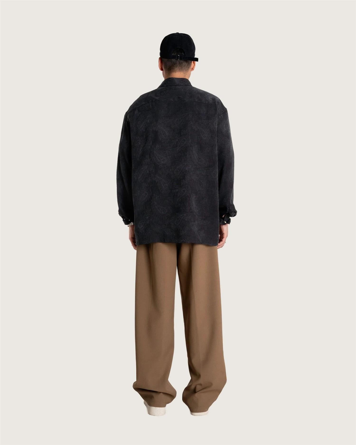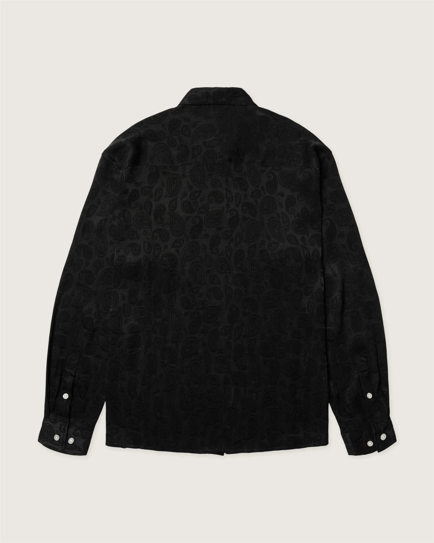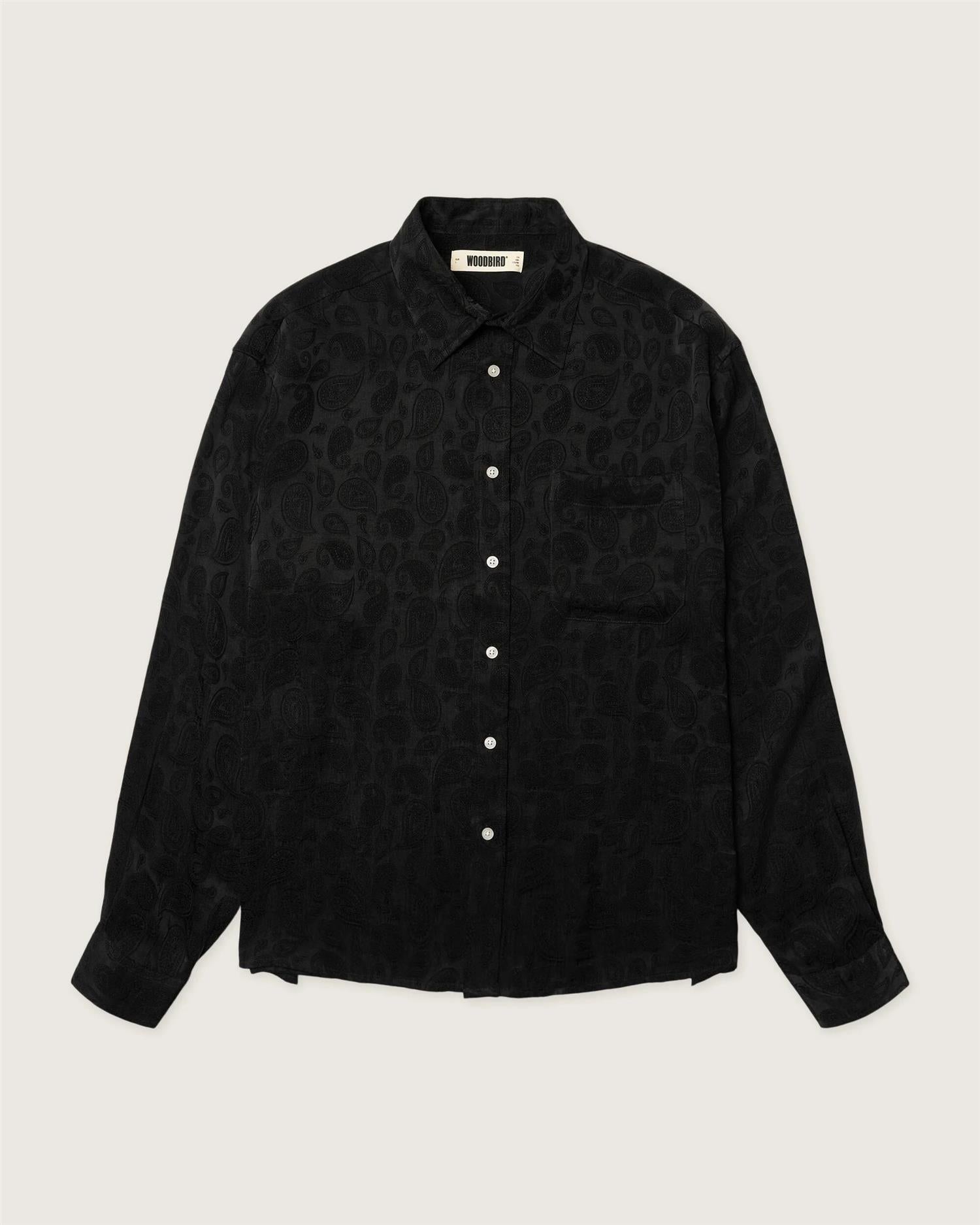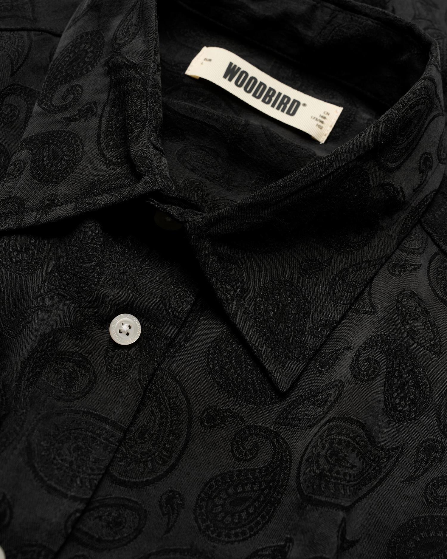 Buzo Paisley Shirt fra Woodbird. Buzo Paisley Shirt er en stilig skjorte med et tonalt paisleymønster vevd inn i en sort base som gir tekstur og personlighet. Den er laget i en eksklusiv blanding av cupro og viskose, som gir et mykt, glatt stoff med en elegant glans. Skjorten har en klassisk spiss krage, glatte knapper og mansjetter med knappelukking. Det subtile paisleymønsteret gir et hint av mystikk og fungerer nærmest som kamuflasje i dempet belysning – perfekt for kvelder ute. Normal i størrelsen.