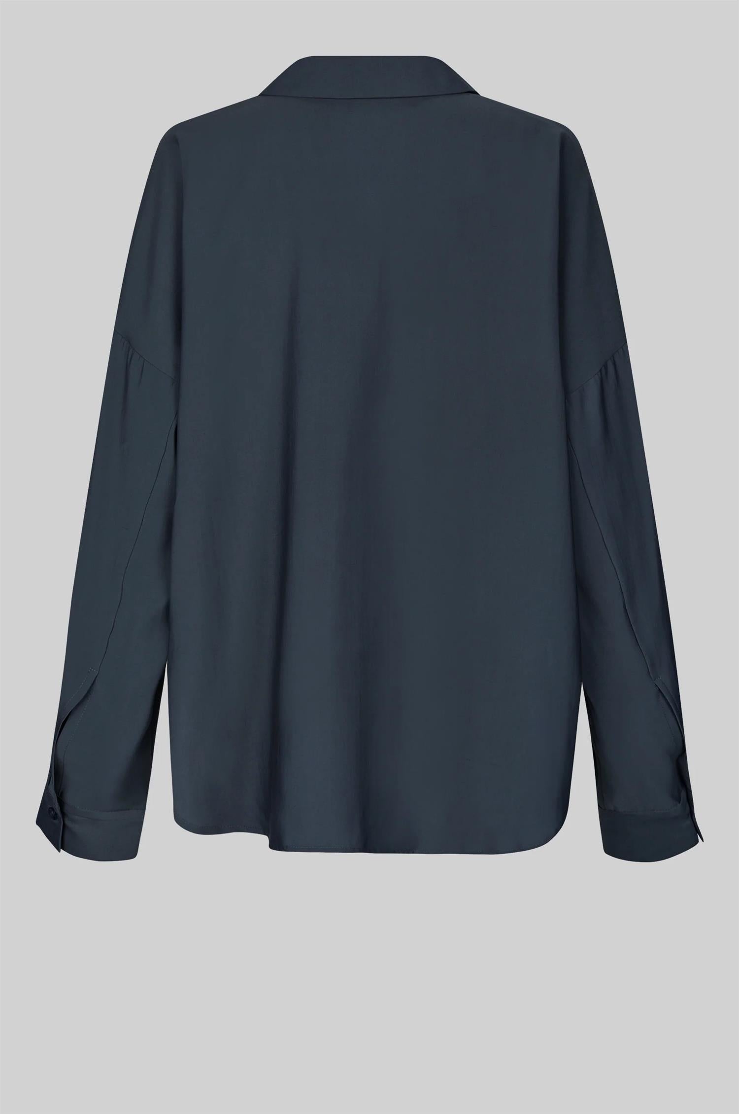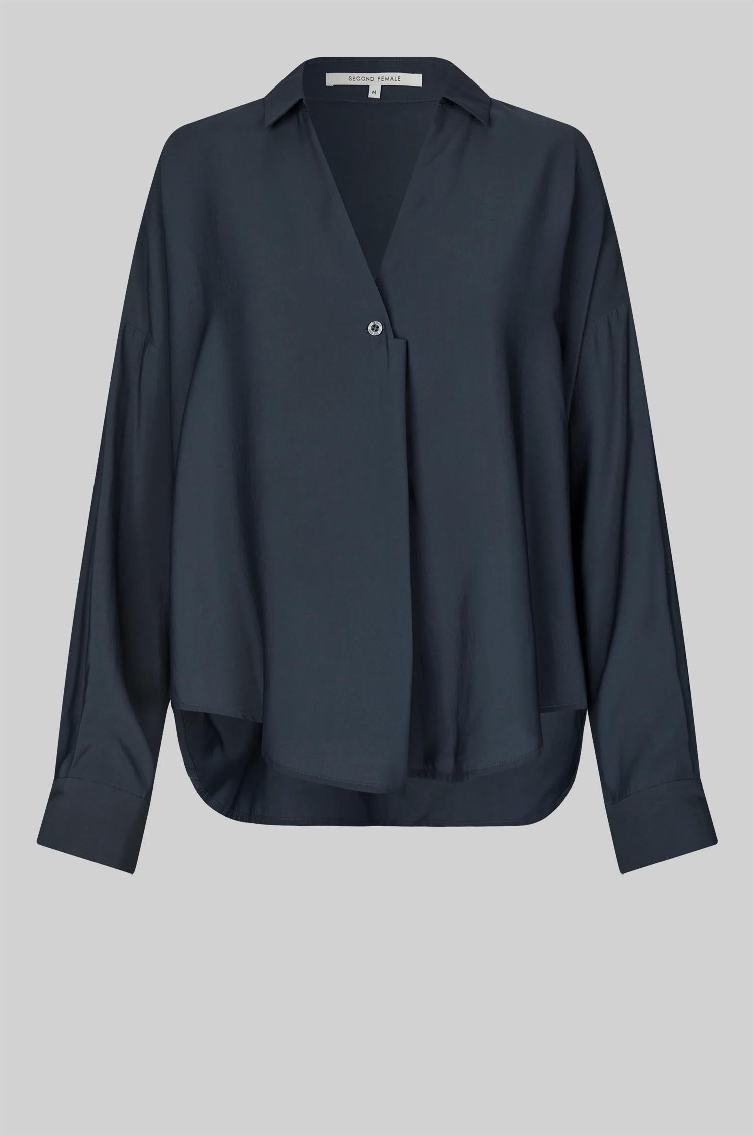 Timeline Blouse fra Second Female. Timeline Blouse er en elegant og avslappet bluse laget i en glatt og behagelig modalblanding. Den har en åpen hals med krage og enkelt knappelukking foran. De droppede skuldrene, lange ermene med mansjetter og den oversized passformen gir blusen et moderne og komfortabelt uttrykk. Et allsidig plagg som passer like godt til jobb som til fritid. Normal i størrelsen.