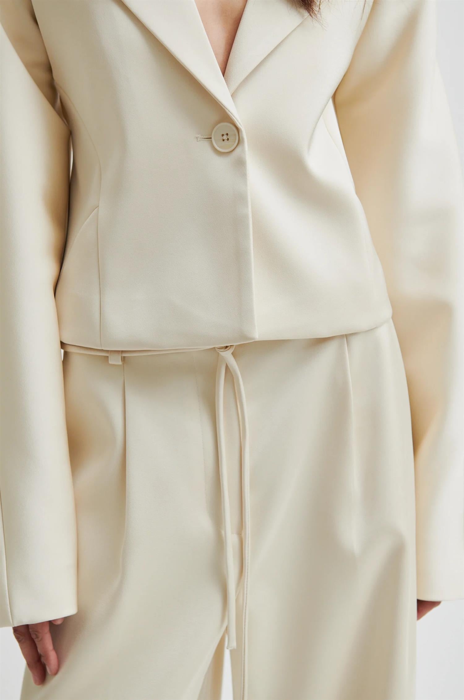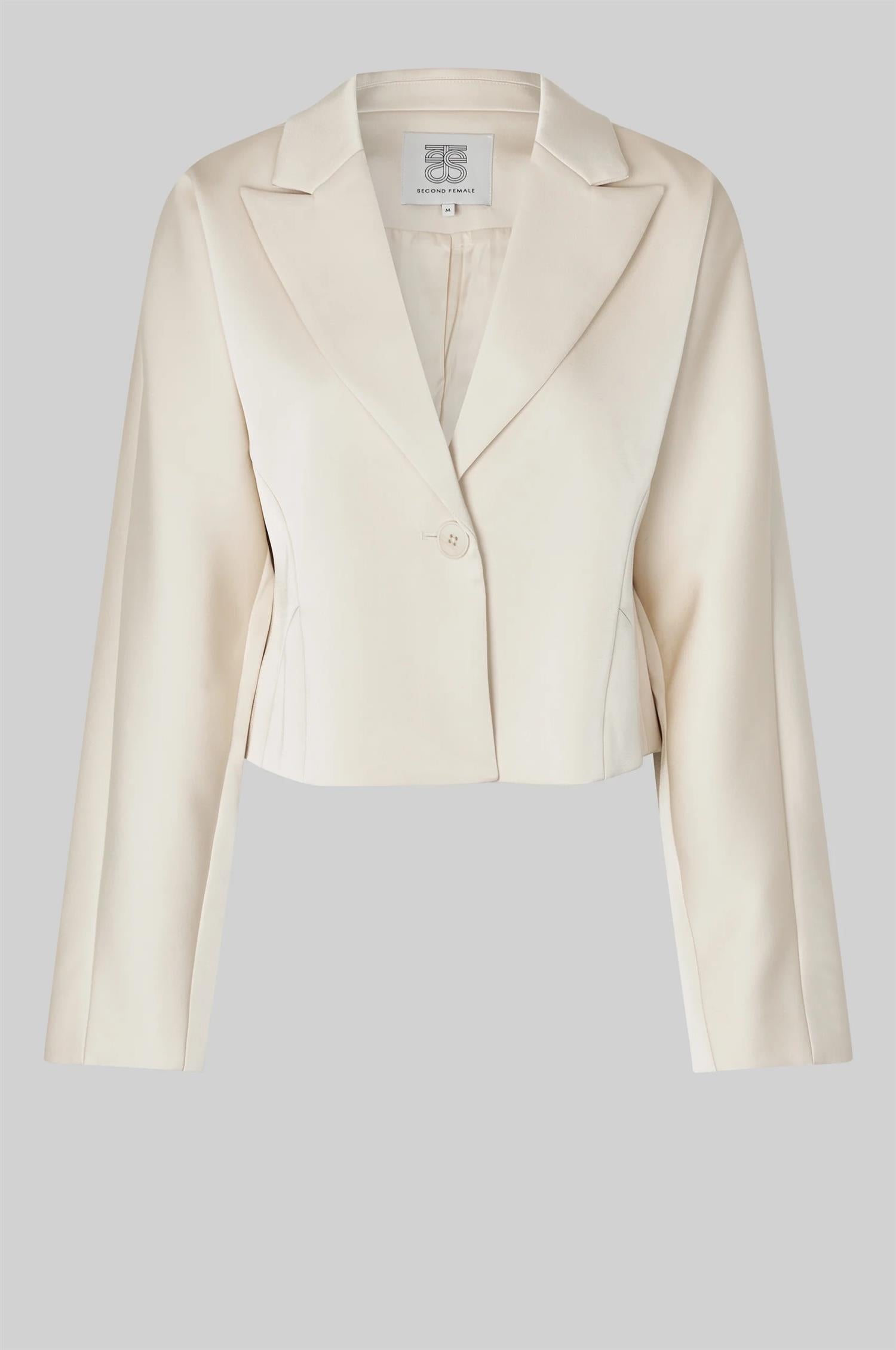 Dazzle Blazer fra Second Female. Dazzle Blazer er en elegant, figursydd blazer laget i et satengstoff med delikat glans. Den har spiss jakkeslag, enkelt knappelukking og innsydde paneler som gir en flatterende og feminin silhuett. Blazeren har vatterte skuldre, lange ermer og er helt fôret for en eksklusiv finish. En tidløs blazer som løfter ethvert antrekk – perfekt til både jobb og festlige anledninger. Normal i størrelsen.