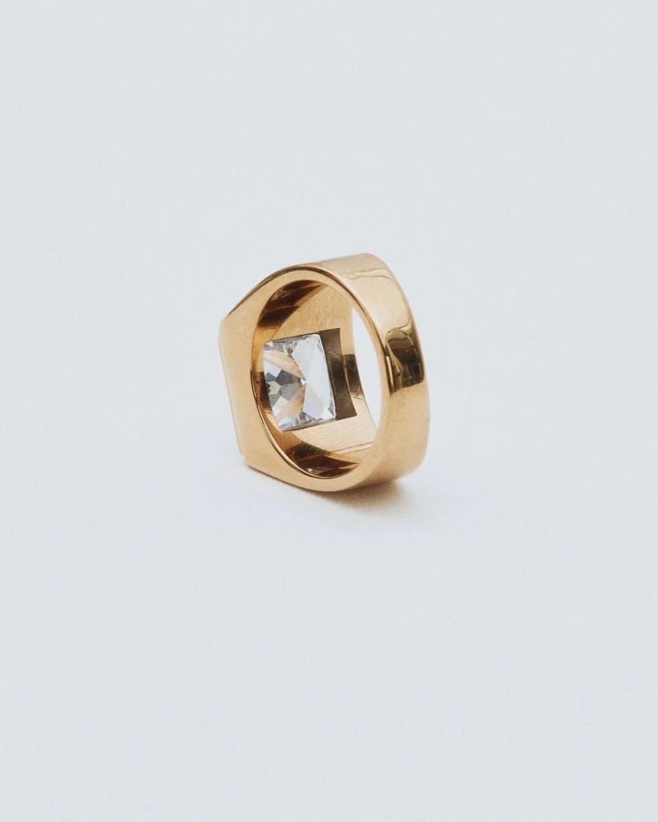 Pantheon Ring Gold fra Edblad. Pantheon-serien er inspirert av det majestetiske taket i Pantheon i Roma og utstråler både eleganse og styrke. Denne ringen i 14K gullbelagt rustfritt stål glitrer vakkert med kubisk zirkon og gir et luksuriøst uttrykk. Et modig og sofistikert smykke som er like fint å bære selv som å gi bort i gave.