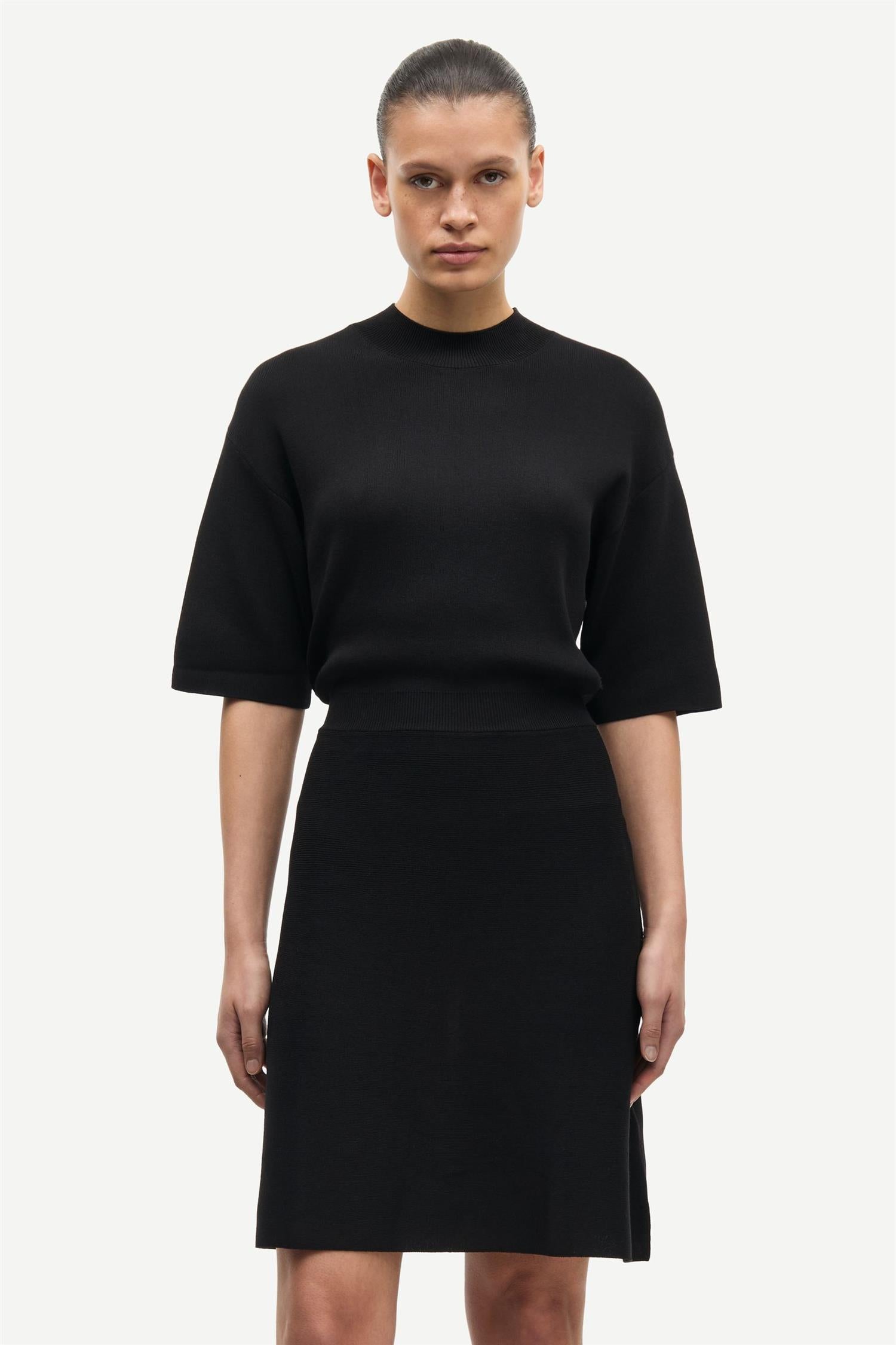 Satatiana Dress 15830 fra Samsøe & Samsøe. Satatiana Dress 15830 er en elegant, strikket minikjole med regular passform, innsvinget midje og et feminint A-skjørt som gir en vakker silhuett. Den er designet med ribbestrikket krage og linning, samt høy hals som skaper et sofistikert og tidløst uttrykk. Perfekt til både hverdags og festlige anledninger. Normal i størrelsen.