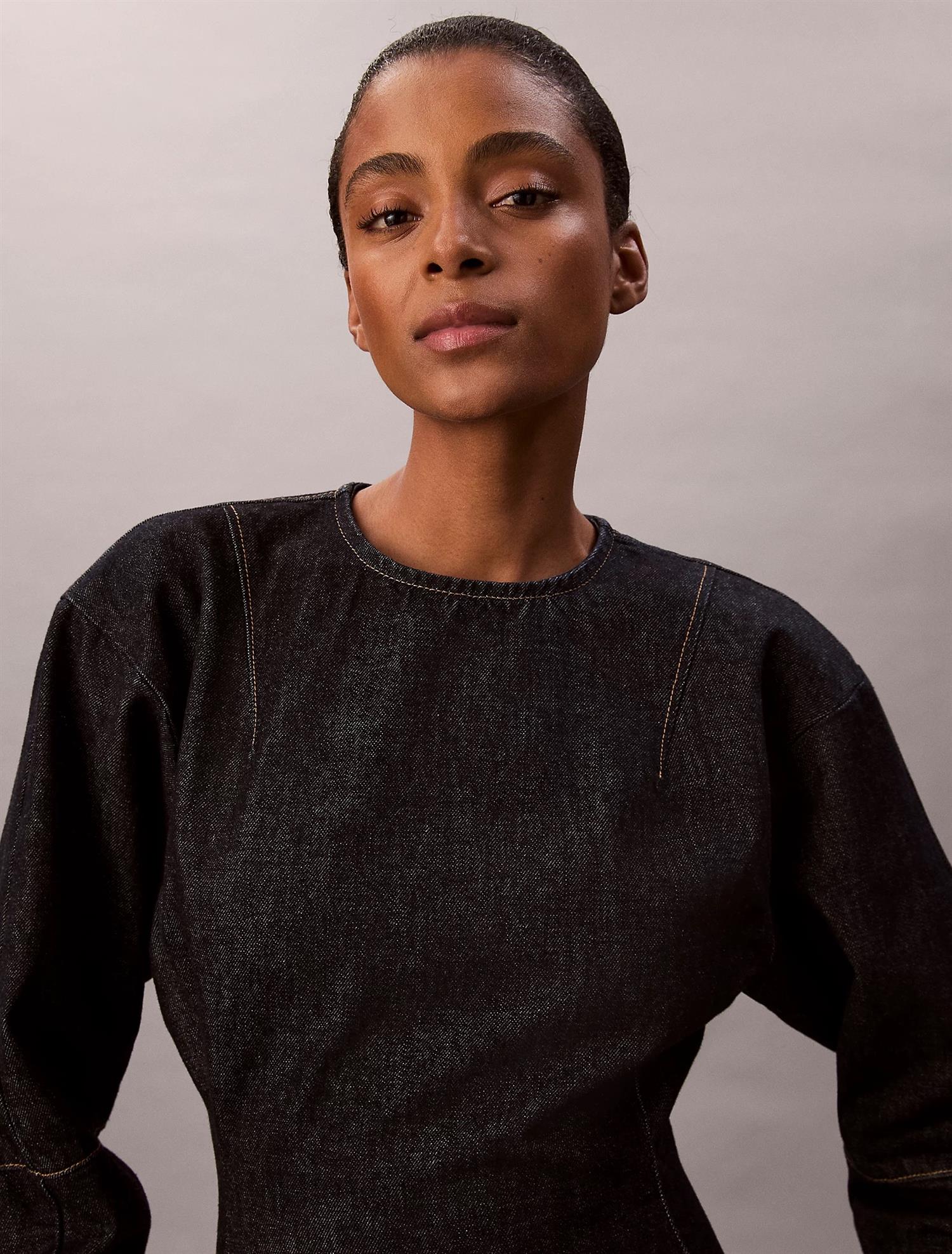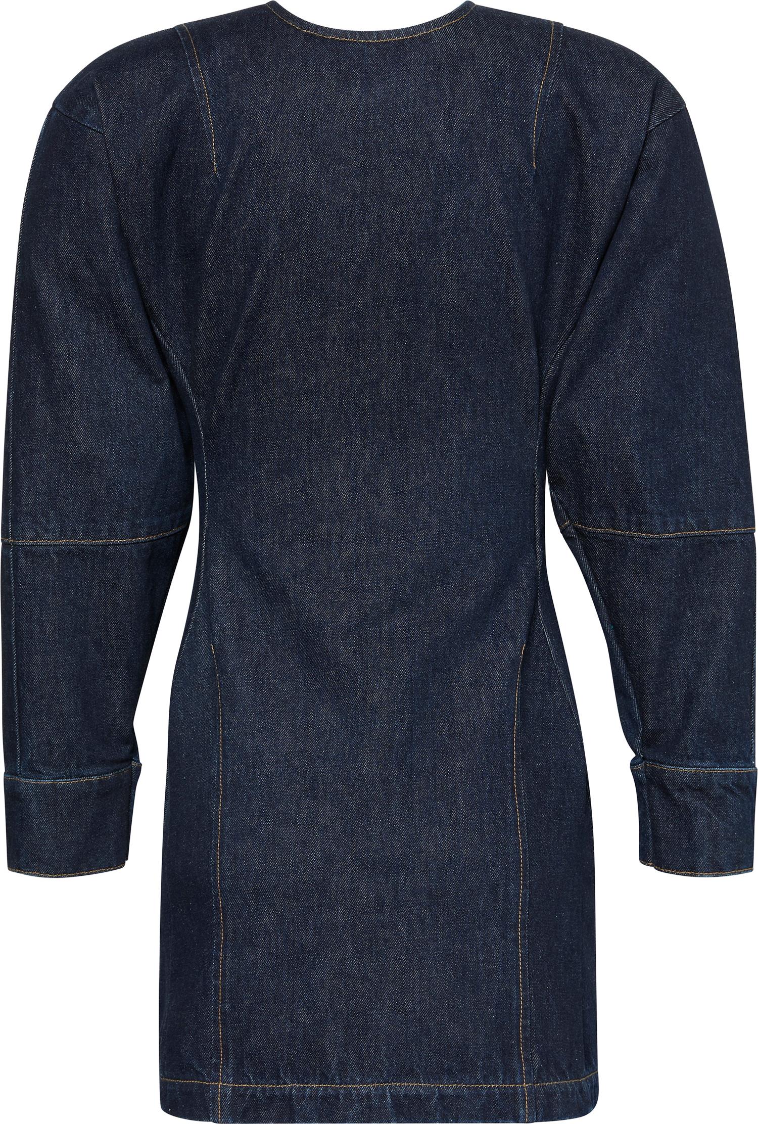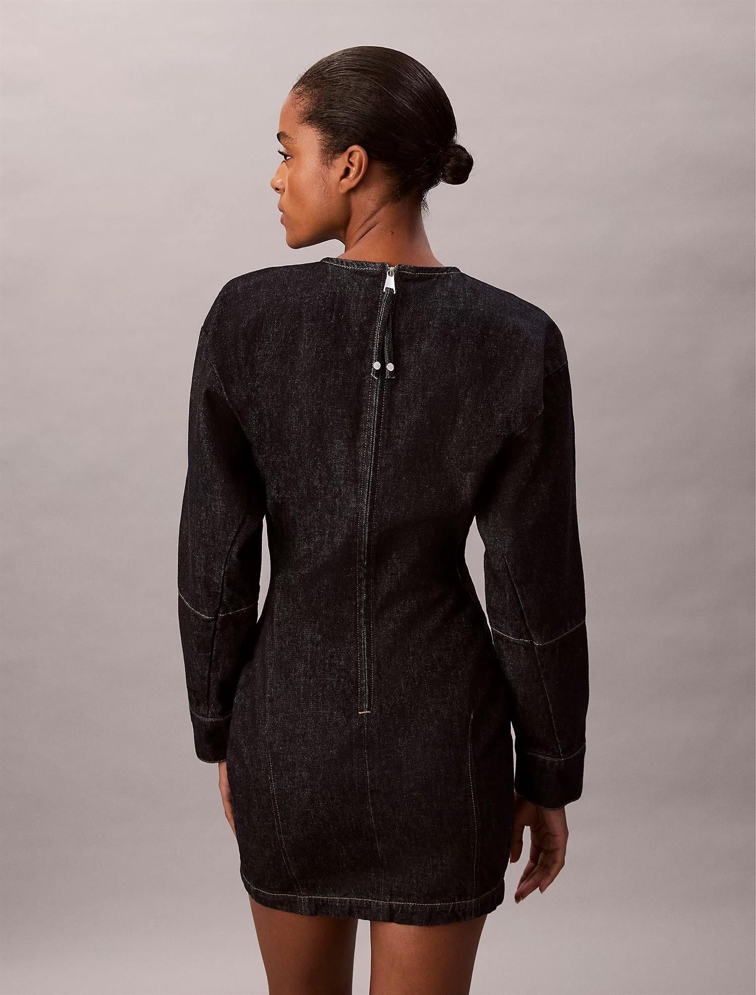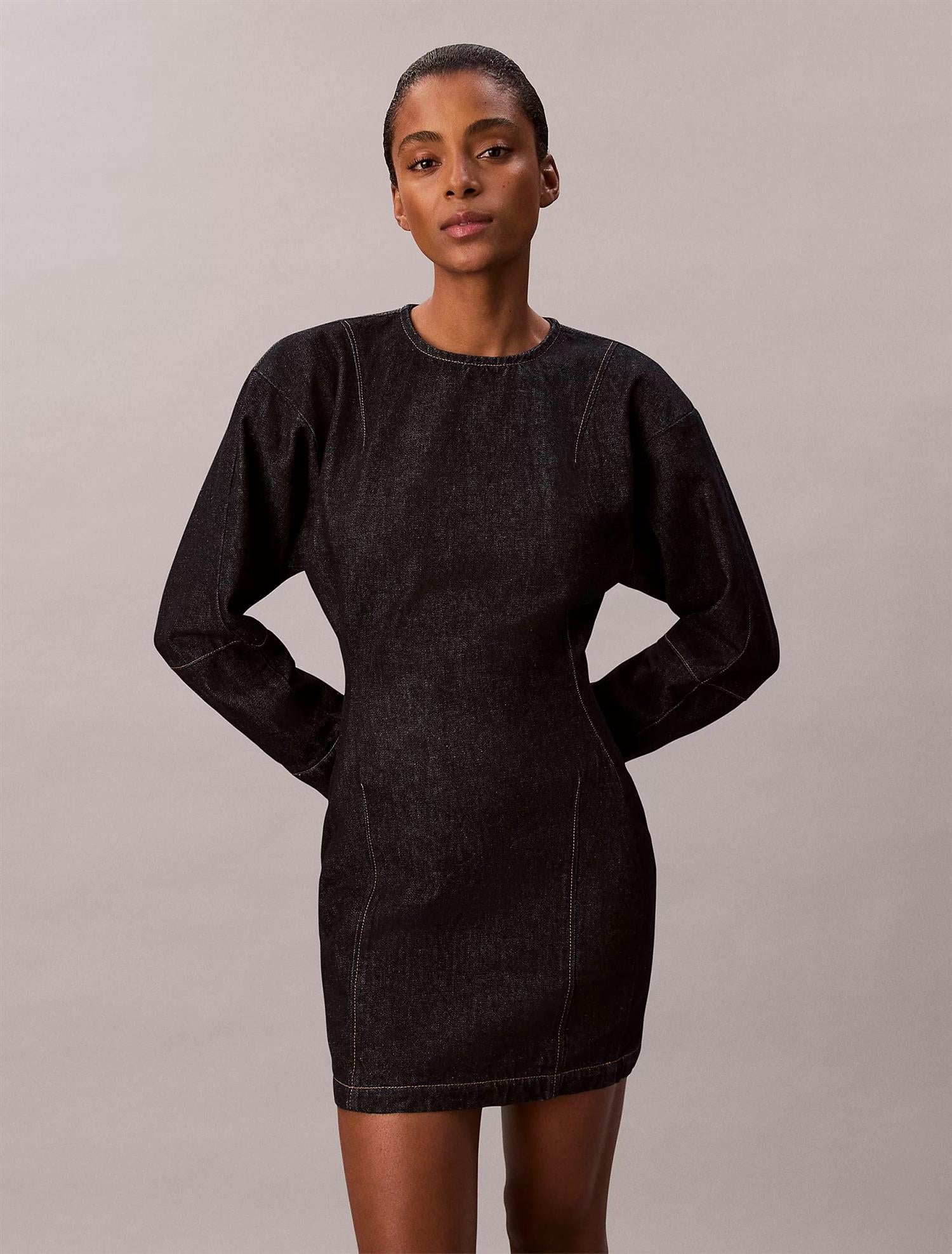 Long Sleeve Denim Mini Dress fra Calvin Klein. Long Sleeve Denim Mini Dress er en stilig denimkjole med en avslappet, boksy passform som smalner inn i midjen for en flatterende og strukturert silhuett. Den er laget i stiv bomullsdenim med en mørk blå resin-finish, og har en synlig metallglidelås bak med Calvin Klein-merket glidelåstrekk. Passer perfekt til både hverdagsbruk og mer pyntede anledninger. Normal i størrelsen.