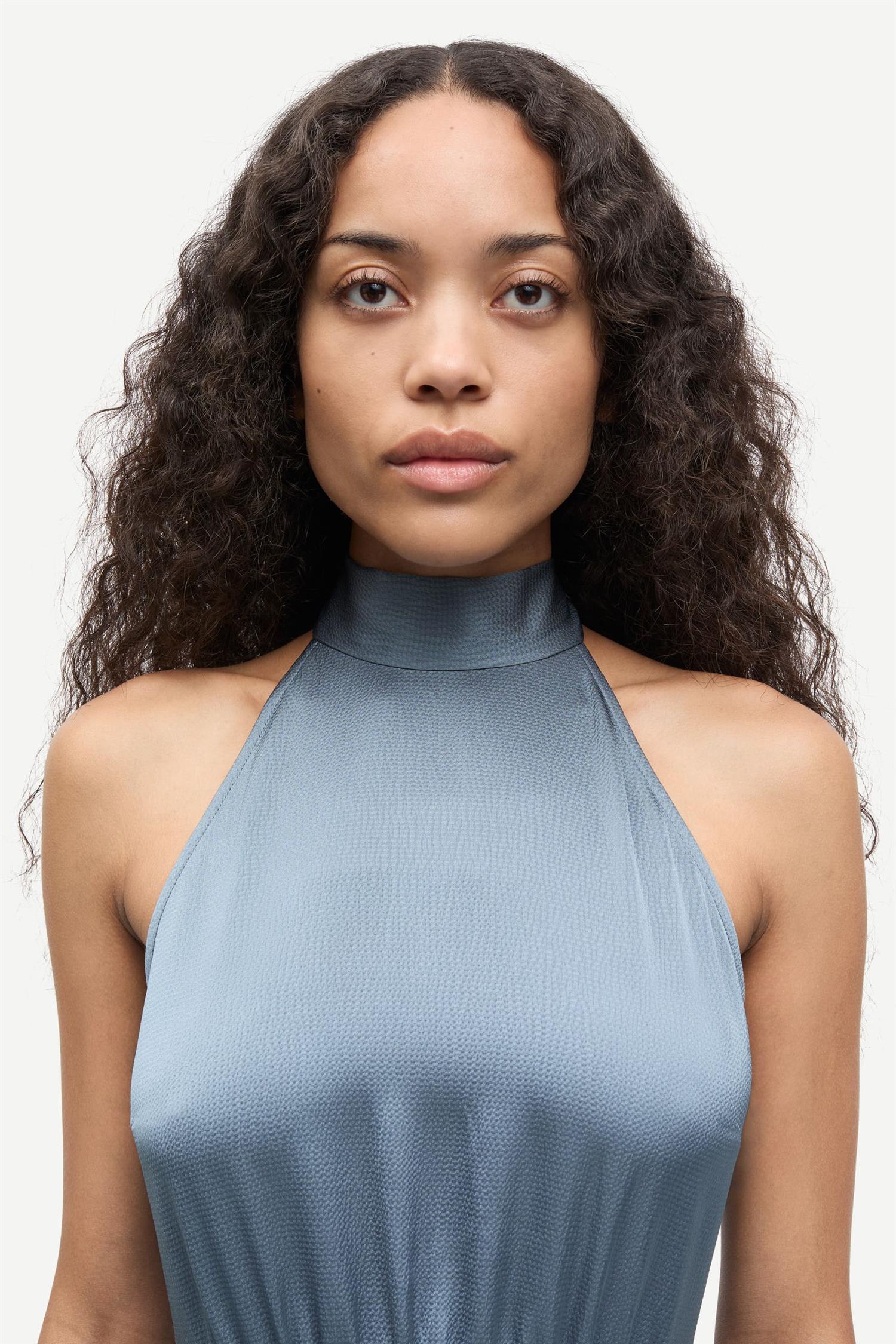 Rheo Dress 12959 fra Samsøe & Samsøe. Rheo Dress 12959 Rheo Dress er en elegant og feminin satengkjole med myk glans og en flatterende silhuett. Den er ermeløs med regular fit og et utsvingt skjørt som faller vakkert langs kroppen. I ryggen har kjolen en justerbar self-tie-detalj, kombinert med en skjult glidelås i siden for en smidig passform. En subtil splitt bak. Normal i størrelsen.