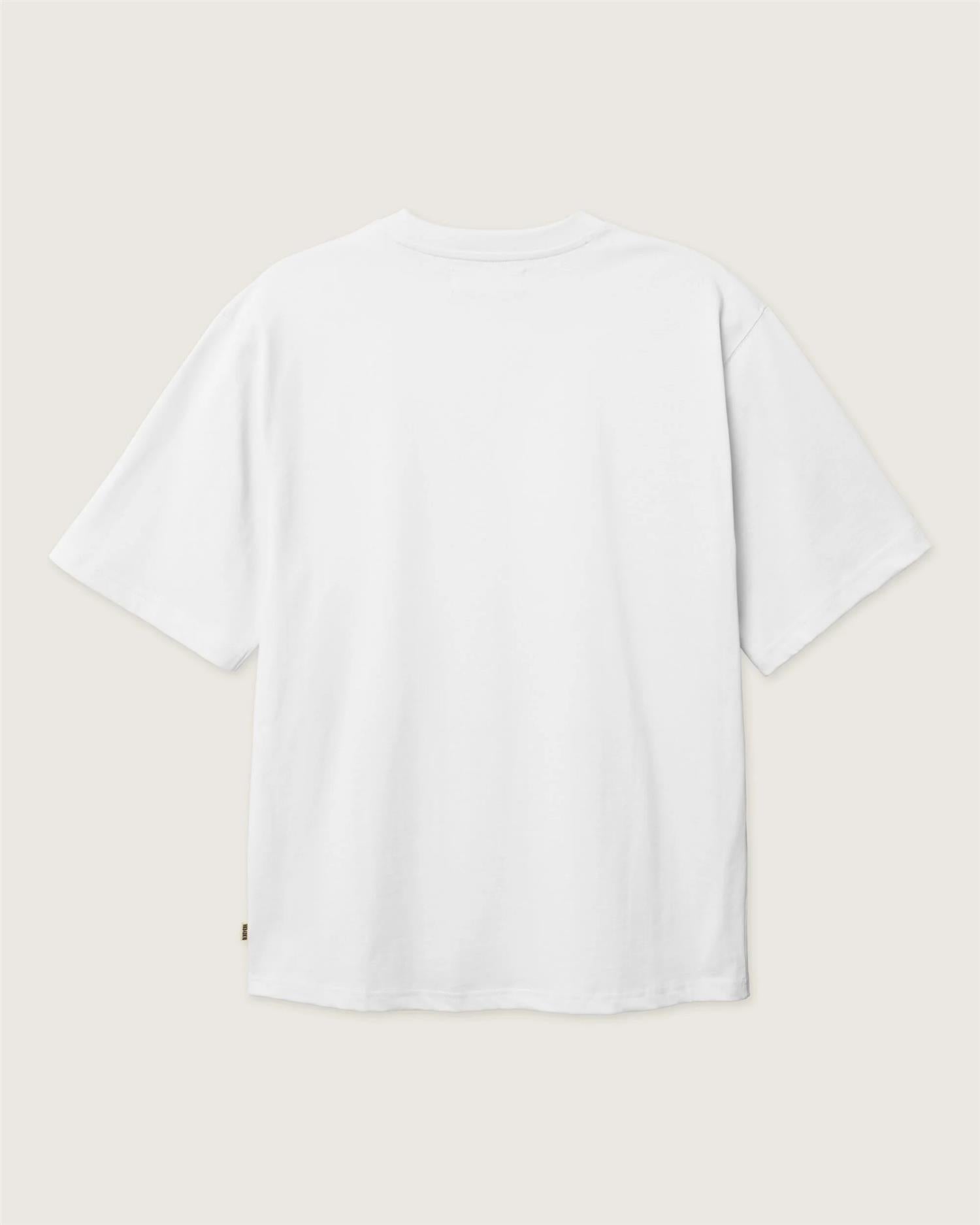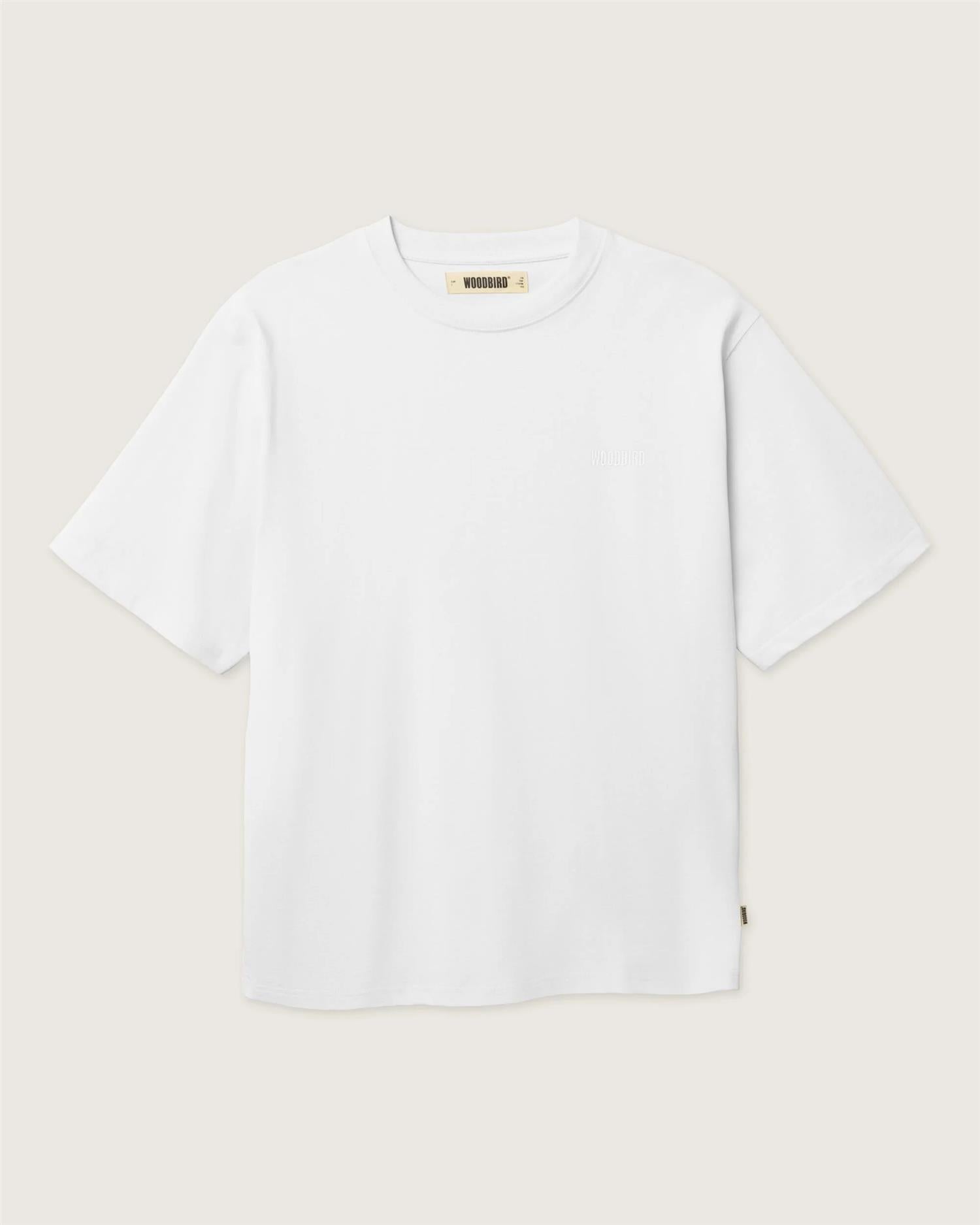 Wbbaine Base Tee fra Woodbird. Baine Base Tee er en klassisk t-skjorte med avslappet passform, designet for komfort og allsidighet i hverdagen. Den har en rund hals, korte ermer og en rett avslutning nederst som gir et tidløst og rent uttrykk. T-skjorten har en diskret brodert logo på brystet. Normal i størrelsen.