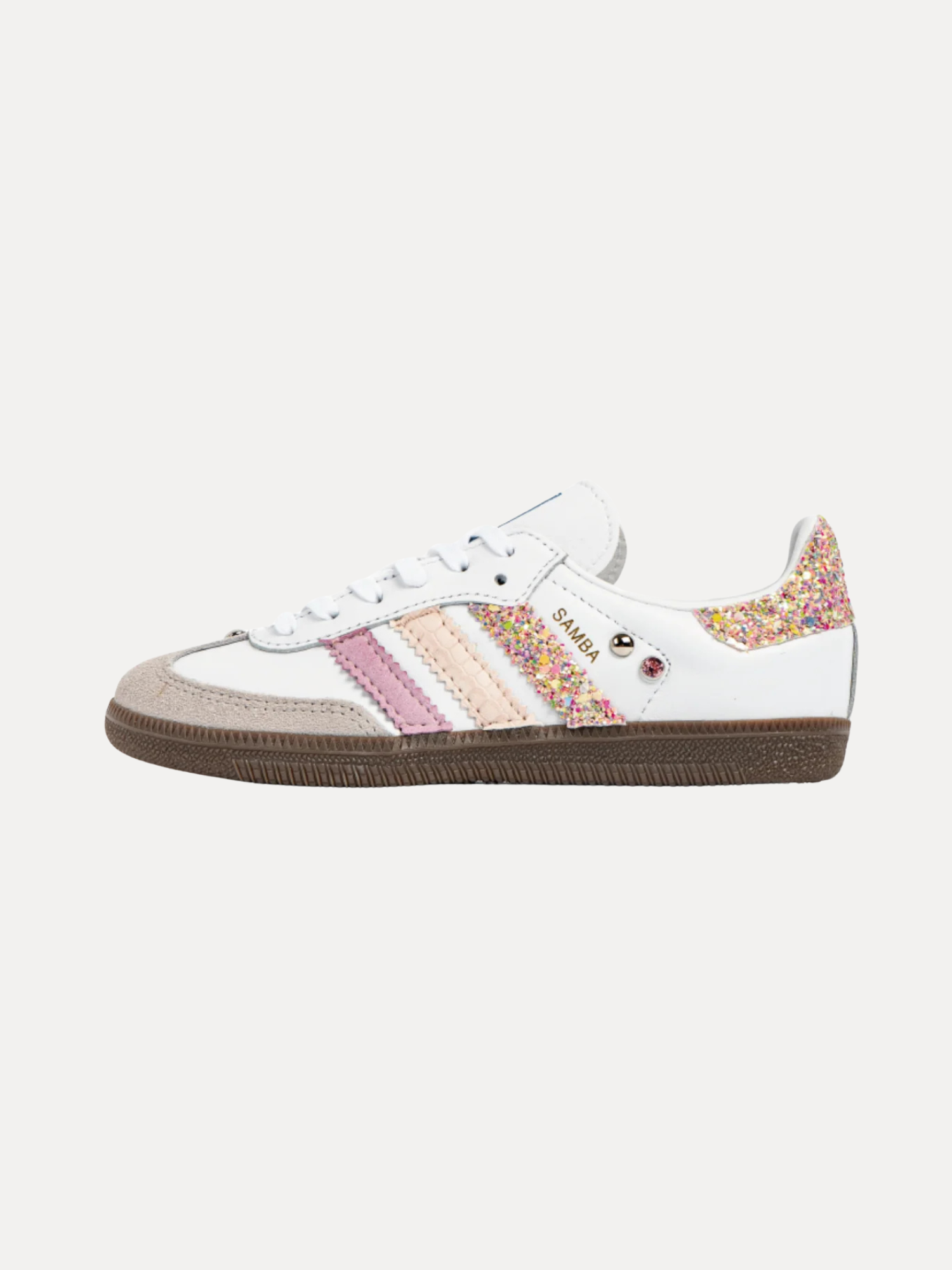 Adidas Samba Shiny Pink fra Adidas Samba X Seddys. Adidas Samba er allerede en ikonisk klassiker, men nå gir Seddys dem en magisk touch. Disse skoene kombinerer tidløs stil med et iøynefallende, kreativt uttrykk – perfekt for deg som vil skille deg ut! Med glitrende striper og et håndlaget design som både er sydd og malt for hånd, er hvert par helt unikt. Normal i størrelsen. Vipper du mellom størrelser gå en halv størrelse ned.