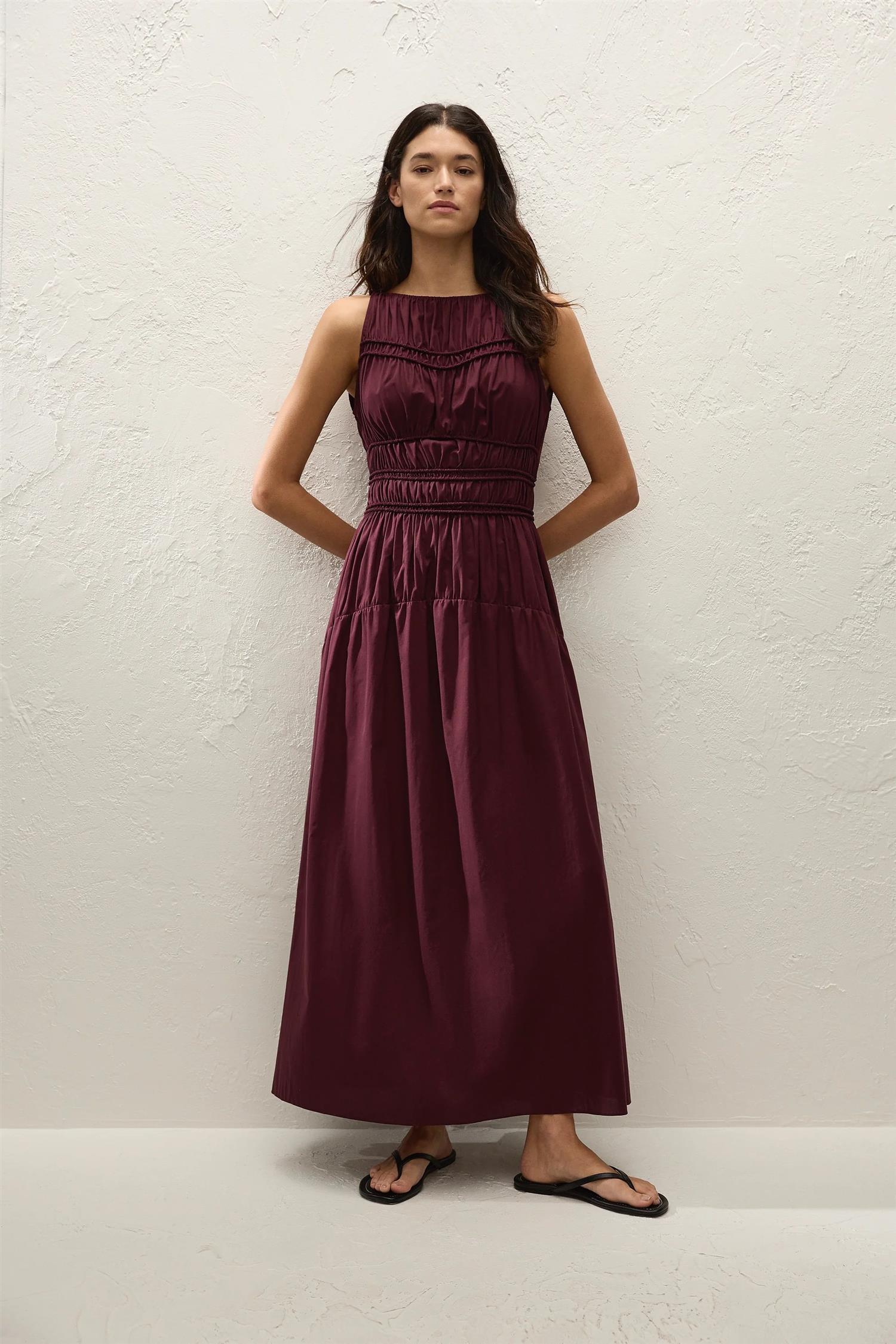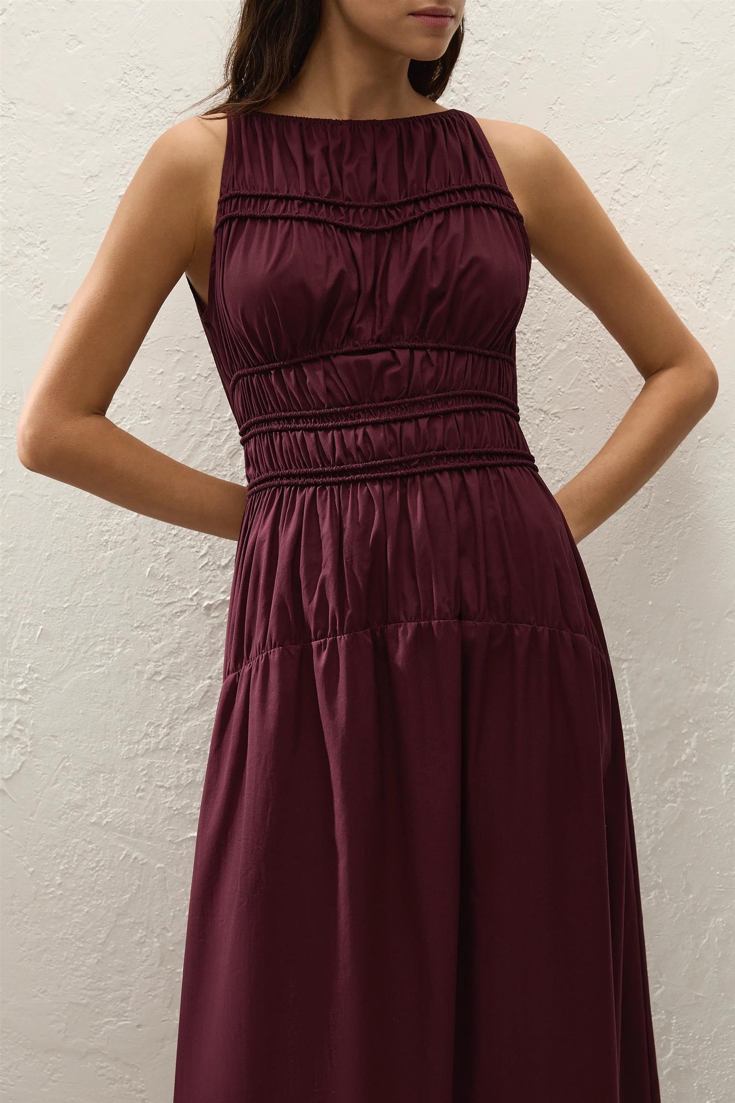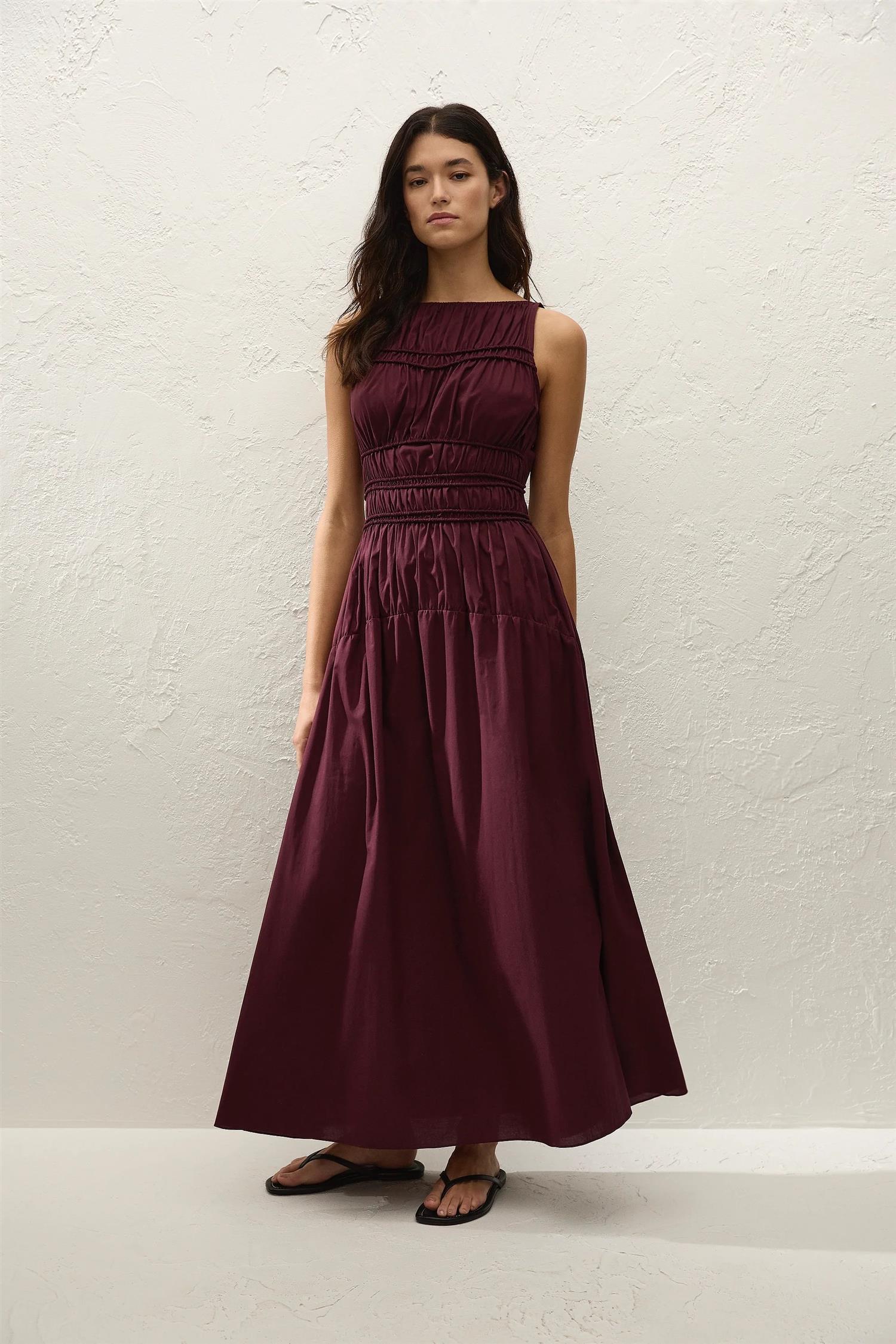 Yael Midi Dress fra Faithfull The Brand. Yael Midi Dress er en enkel og elegant midikjole laget i 100% økologisk bomull i en dyp mulberry-farge. Kjolen er ermeløs med båthals og har en smocket overdel med elastiske detaljer som gir en flatterende passform og god komfort. Den droppede midjen faller ned i et mykt A-formet skjørt som rekker til like over anklene. En lett og behagelig kjole som er enkel å style til ulike anledninger og sesonger. Normal i størrelsen, med ekstra stretch i overdelen.