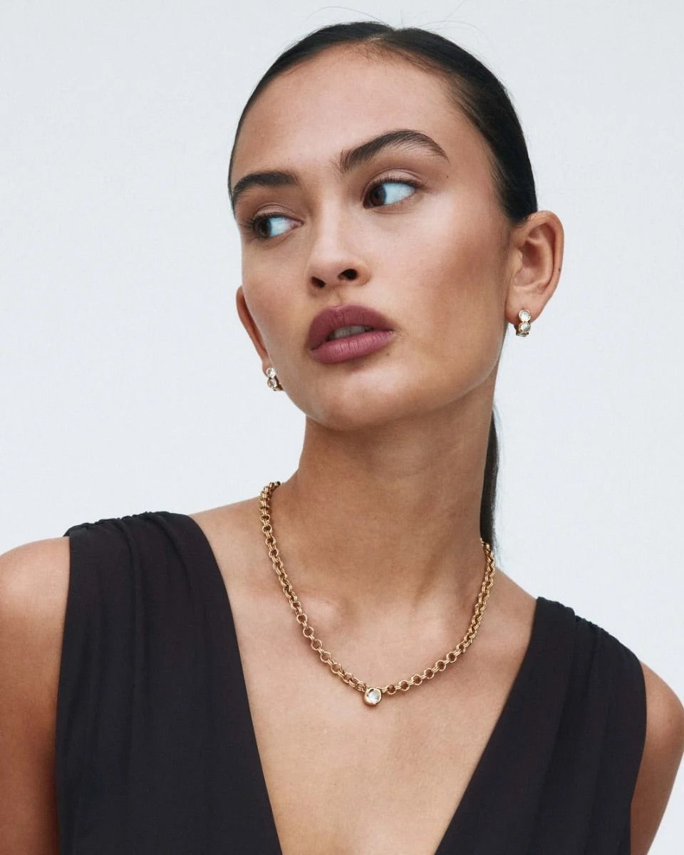 Ocean Gem Necklace L Gold fra Edblad. Ocean Gem Necklace L har et uttrykksfullt design inspirert av skjellenes organiske former og solens refleksjon på havoverflaten. Halskjedet har et kraftig kjede med doble lenker og en stor, glitrende stein i midten som gir et elegant statement-uttrykk. Perfekt alene eller kombinert med øredobber eller ring fra samme serie.