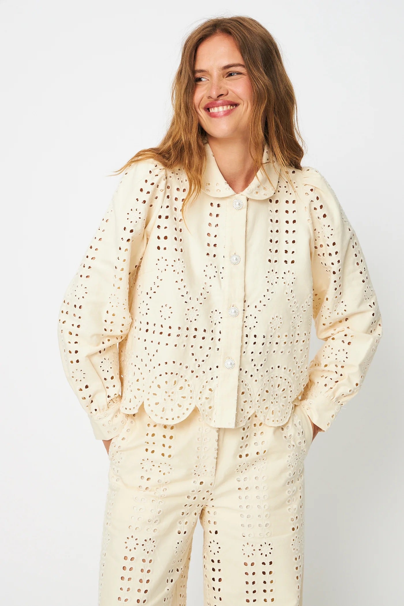 Spiritcras Shirt fra Crās. Spiritcras Shirt er en feminin skjorte i brodert bomull som gir et lett og romantisk uttrykk. Designet har klassisk krage, lange ermer og markante knapper i front som gir skjorten et karakteristisk preg. Den løse passformen gir en avslappet silhuett og gjør den enkel å style både til hverdags og mer pyntede anledninger. Normal i størrelsen.