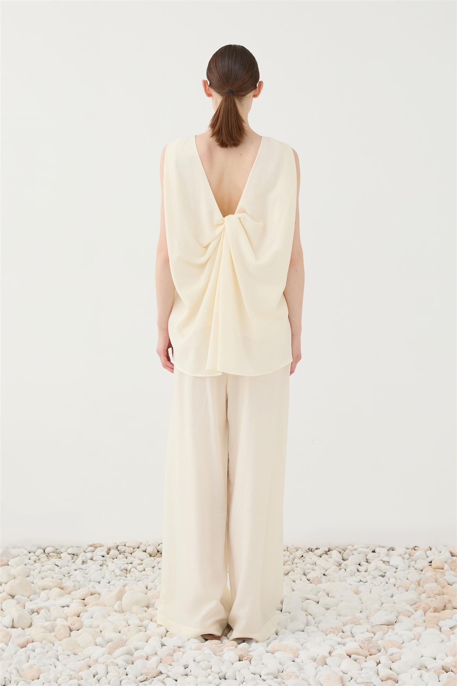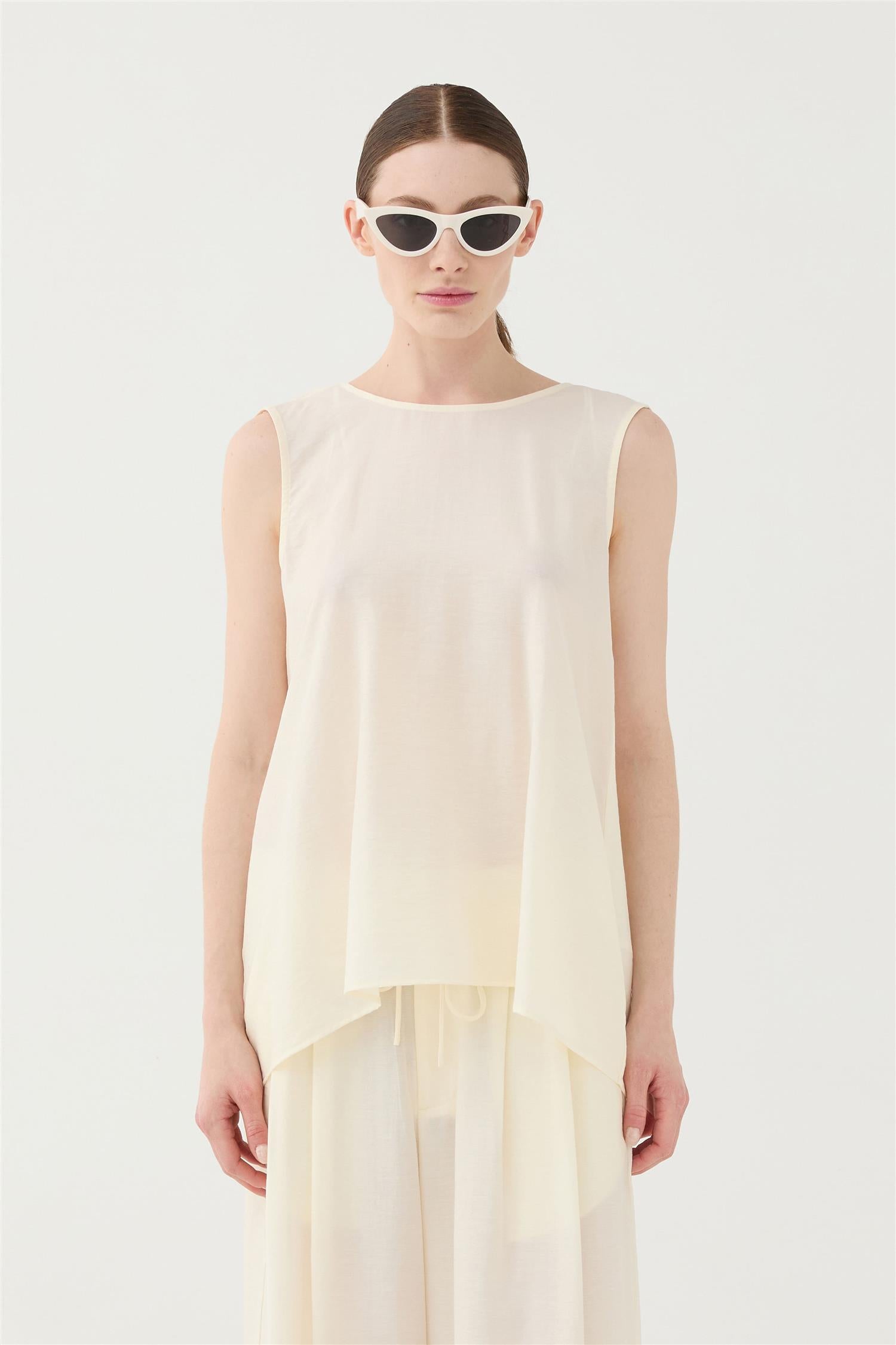 Twist Back Top Bianco Panna fra Eleh. Twist Back Top Bianco Panna er en elegant ermeløs topp med en ren, flytende silhuett og et karakteristisk vridd parti i ryggen som gir et skulpturelt og moderne uttrykk. Det lette stoffet gir et vakkert fall, mens den enkle fronten gjør toppen enkel å style både til hverdag og mer pyntede antrekk. Normal i størrelsen.