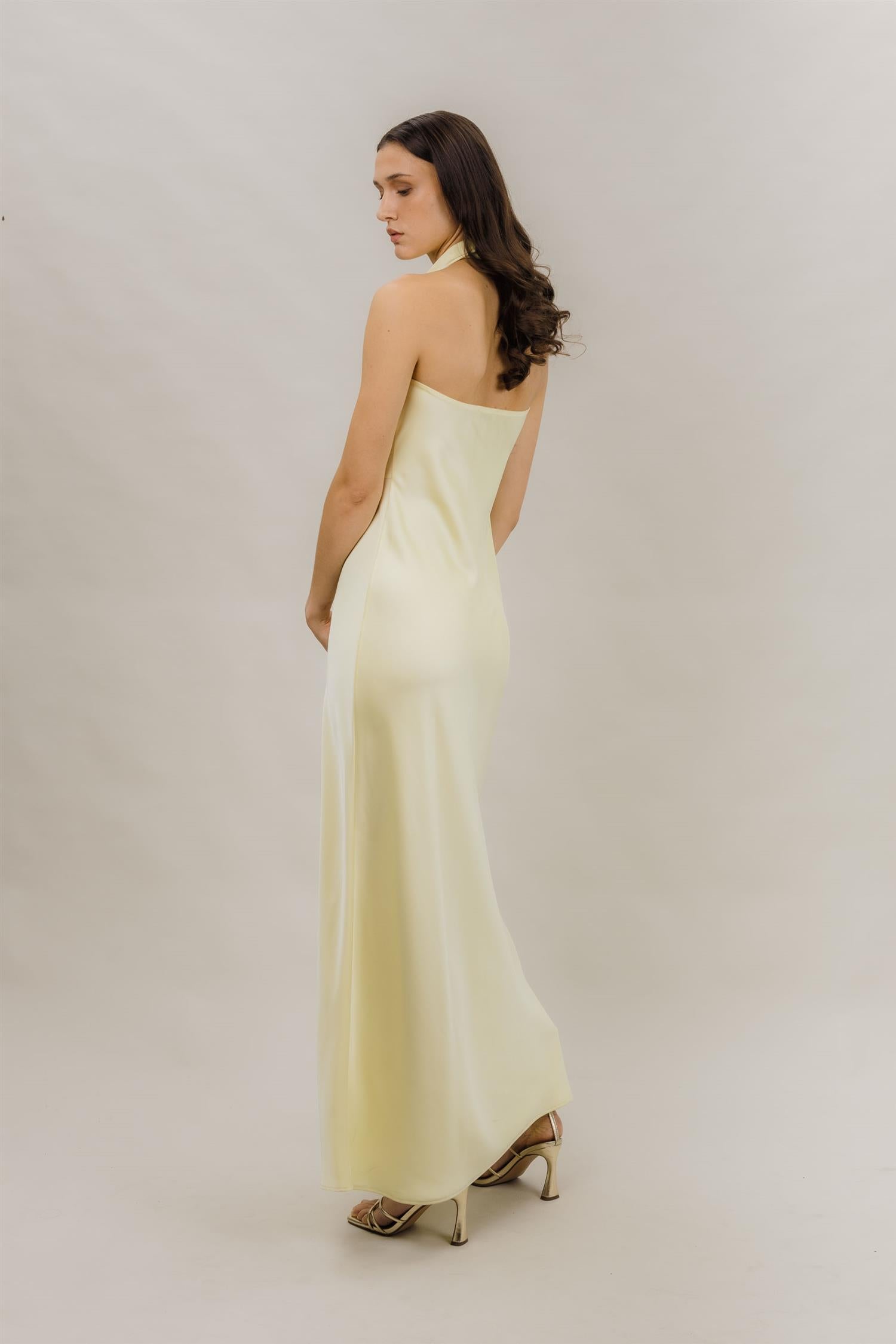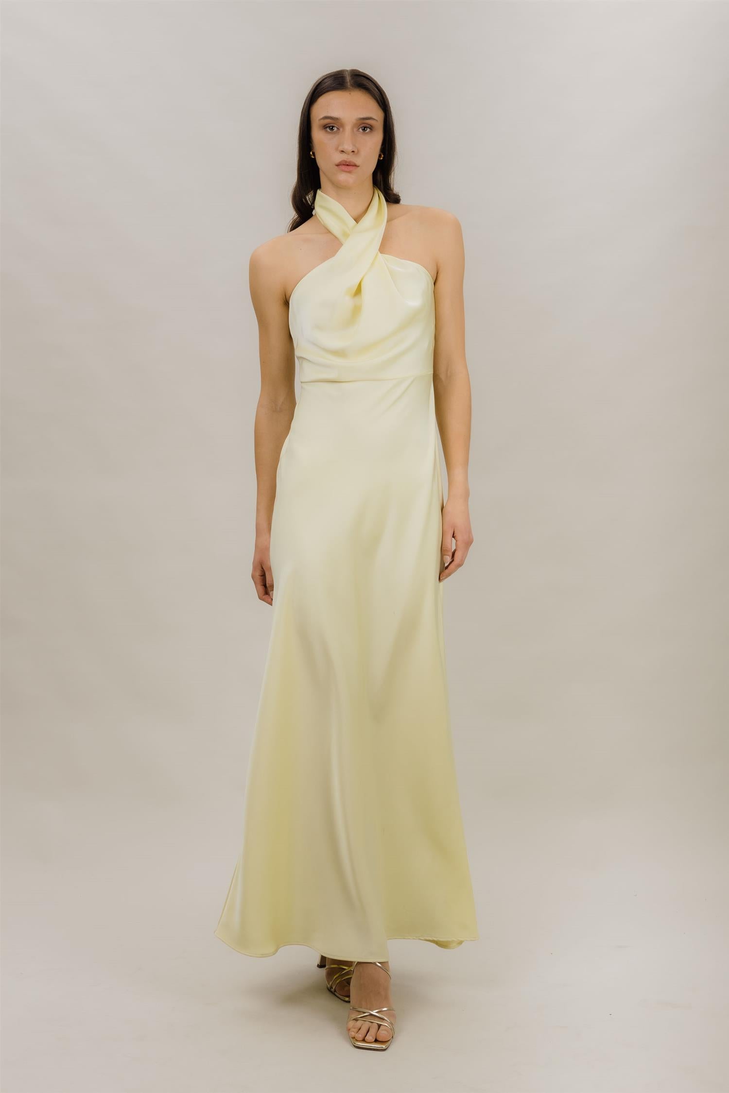 Dolores Dress fra Urban Pioneers. Dolores Dress er en nydelig maxikjole med halterneck-design og en elegant, flytende silhuett med vakre draperte detaljer. Perfekt valg til festlige anledninger, bryllup eller andre spesielle begivenheter. Lukkes i nakken for en ren og stilfull finish. Normal i størrelsen.