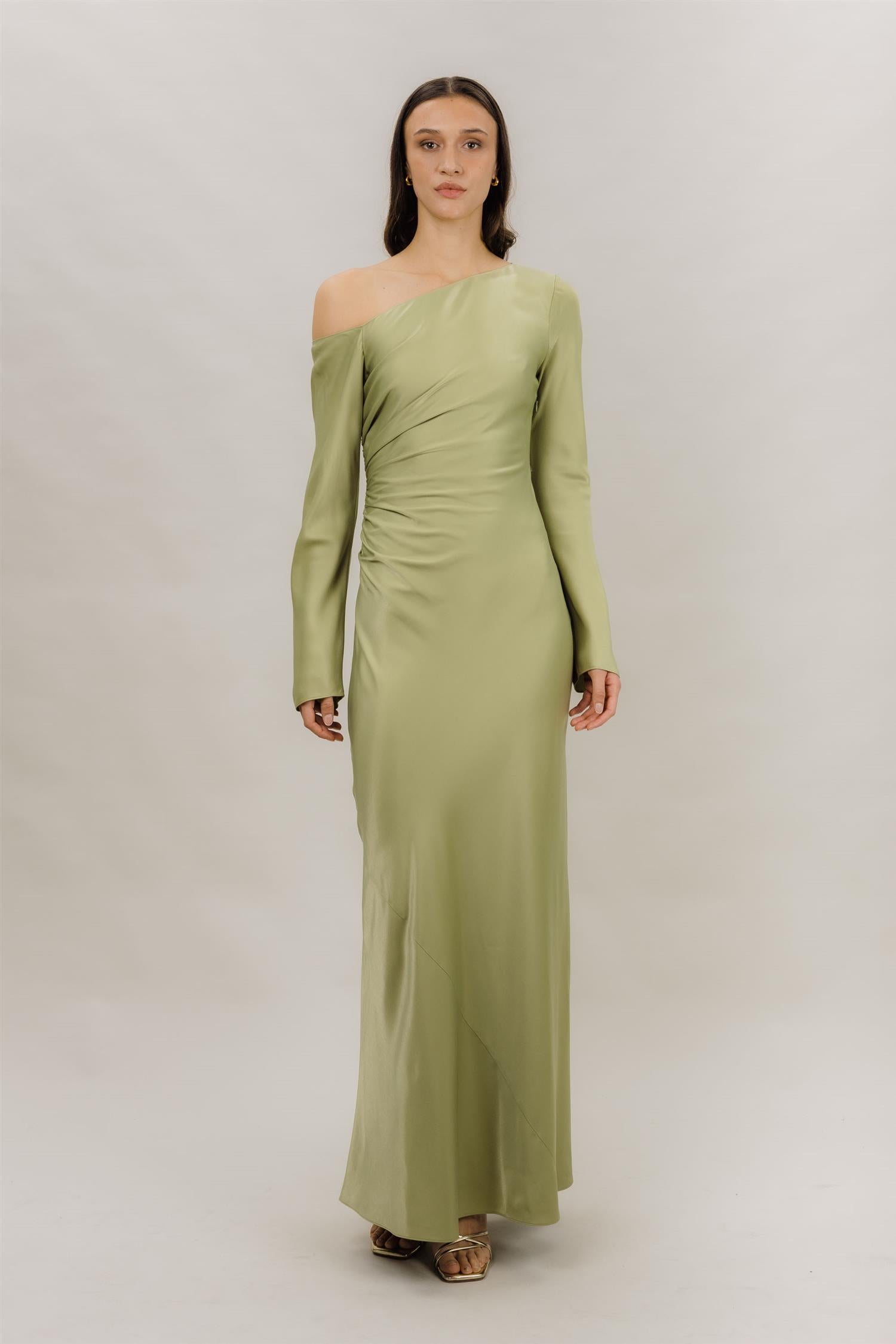 Montana Dress fra Urban Pioneers. Montana Dress er en elegant maxikjole i den delikate nyansen Sage Green. Designet har en feminin one-shoulder-silhuett med lange ermer og flatterende rynkedetaljer i midjen som fremhever figuren. Det lange, lett utsvingte skjørtet gir et flytende og sofistikert uttrykk – perfekt til både selskap og spesielle anledninger. Normal i størrelsen.