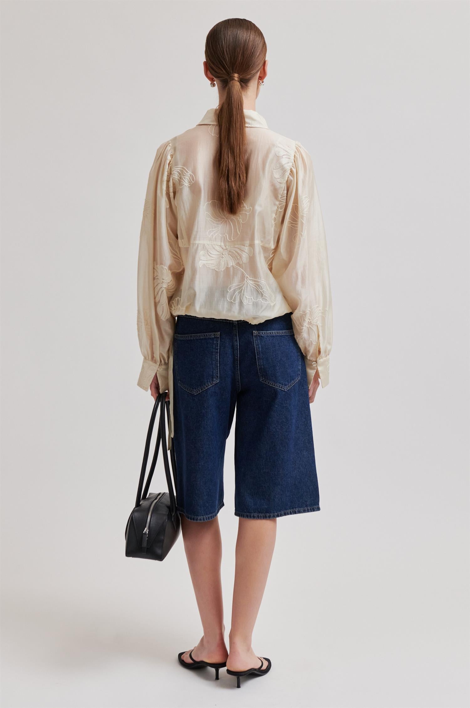 Vira Blouse fra Second Female. Vira Blouse er en elegant bluse i en semitransparent kvalitet med ton-i-ton broderier som gir et sofistikert uttrykk. Designet har klassisk krage, skjult knappelukking i front og lange ermer med mansjetter. Knytedetalj i nederkant gir en feminin silhuett og gjør blusen enkel å tilpasse. Normal i størrelsen.
