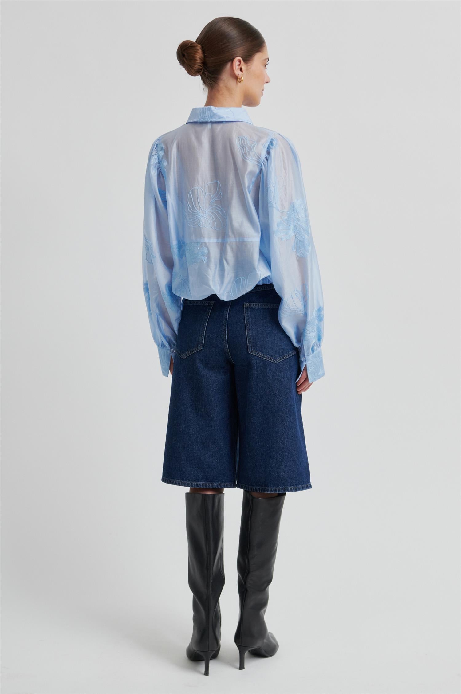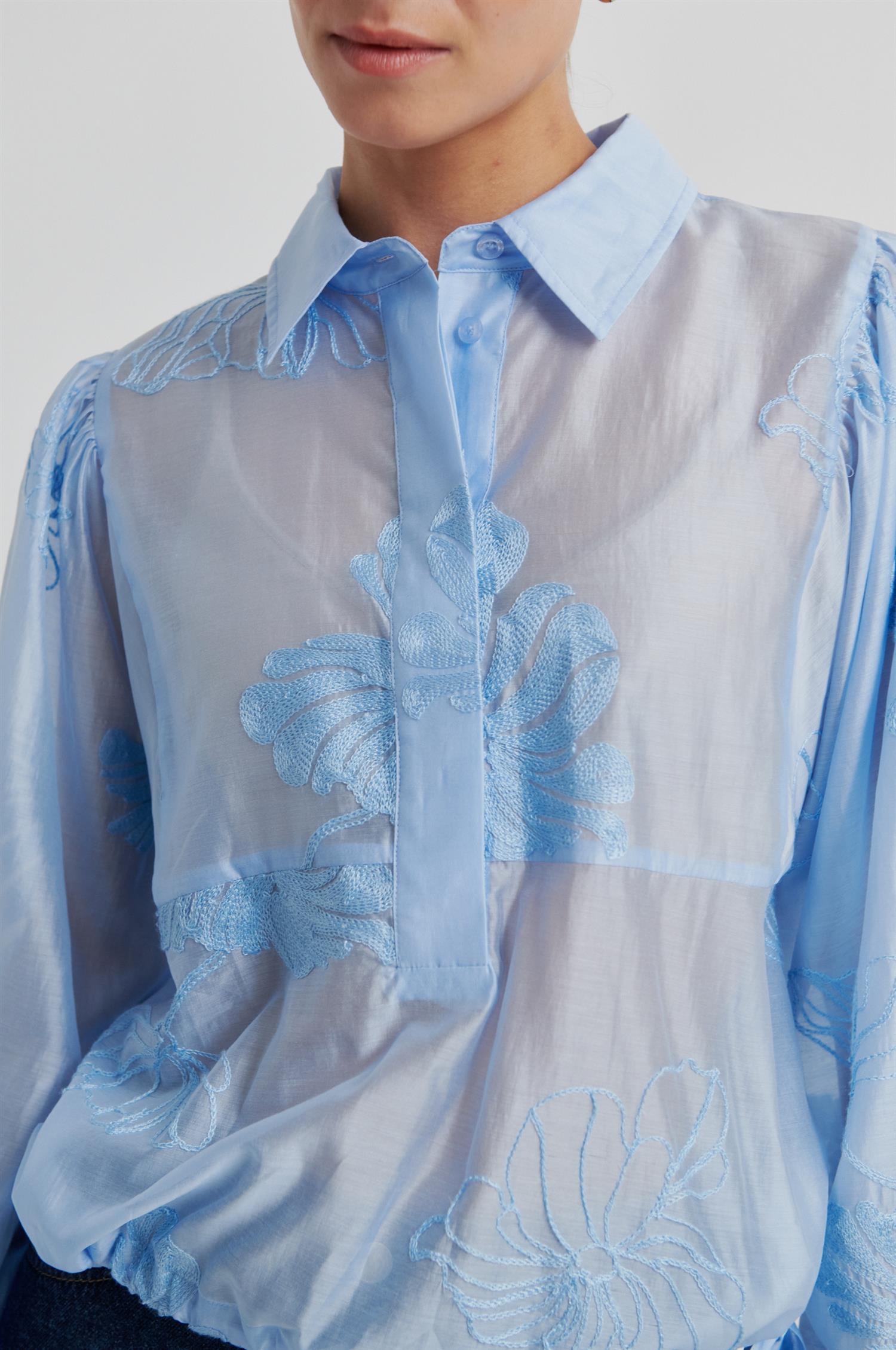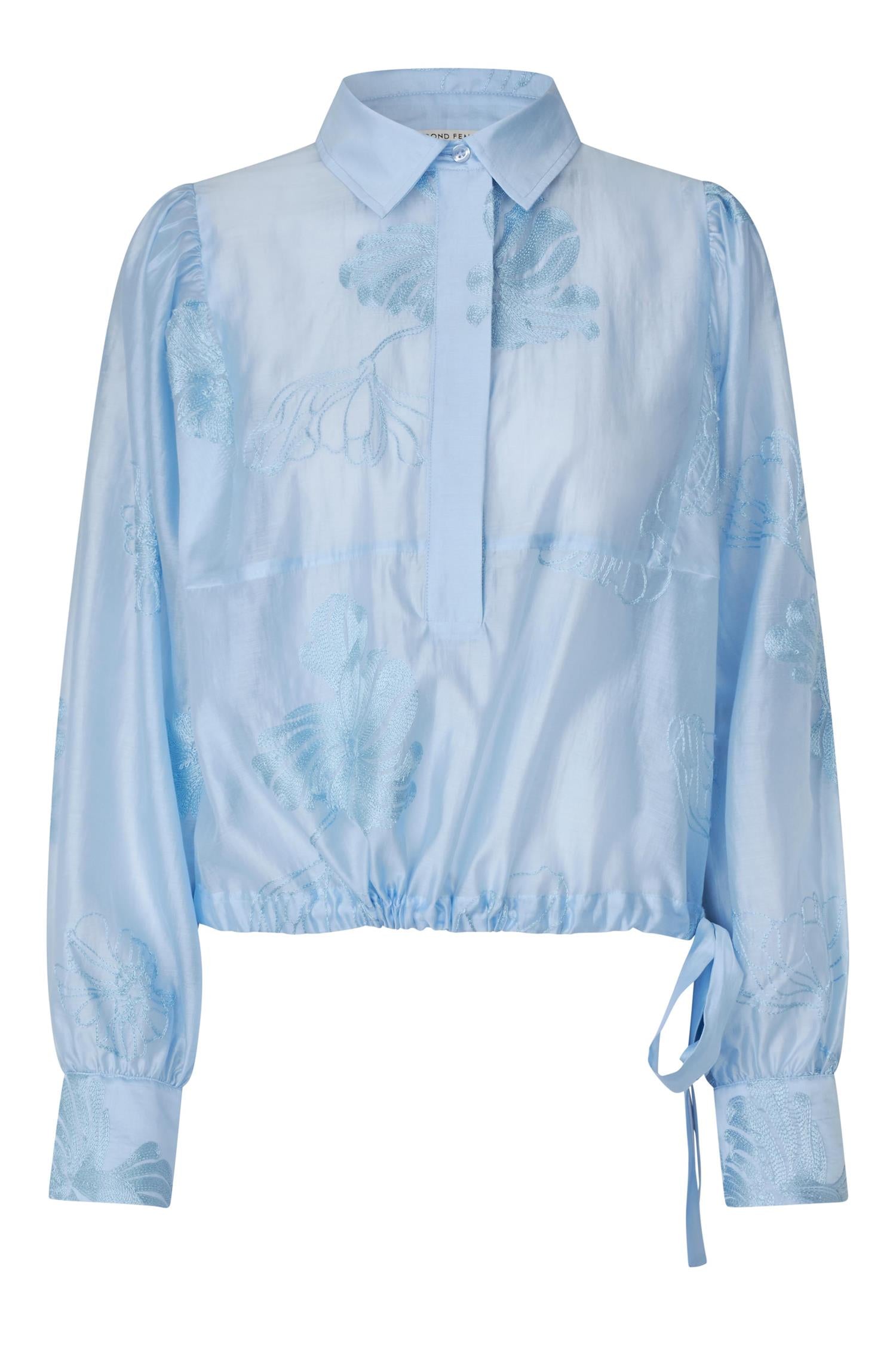 Vira Blouse fra Second Female. Vira Blouse er en elegant bluse i en semitransparent kvalitet med ton-i-ton broderier som gir et sofistikert uttrykk. Designet har klassisk krage, skjult knappelukking i front og lange ermer med mansjetter. Knytedetalj i nederkant gir en feminin silhuett og gjør blusen enkel å tilpasse. Normal i størrelsen.