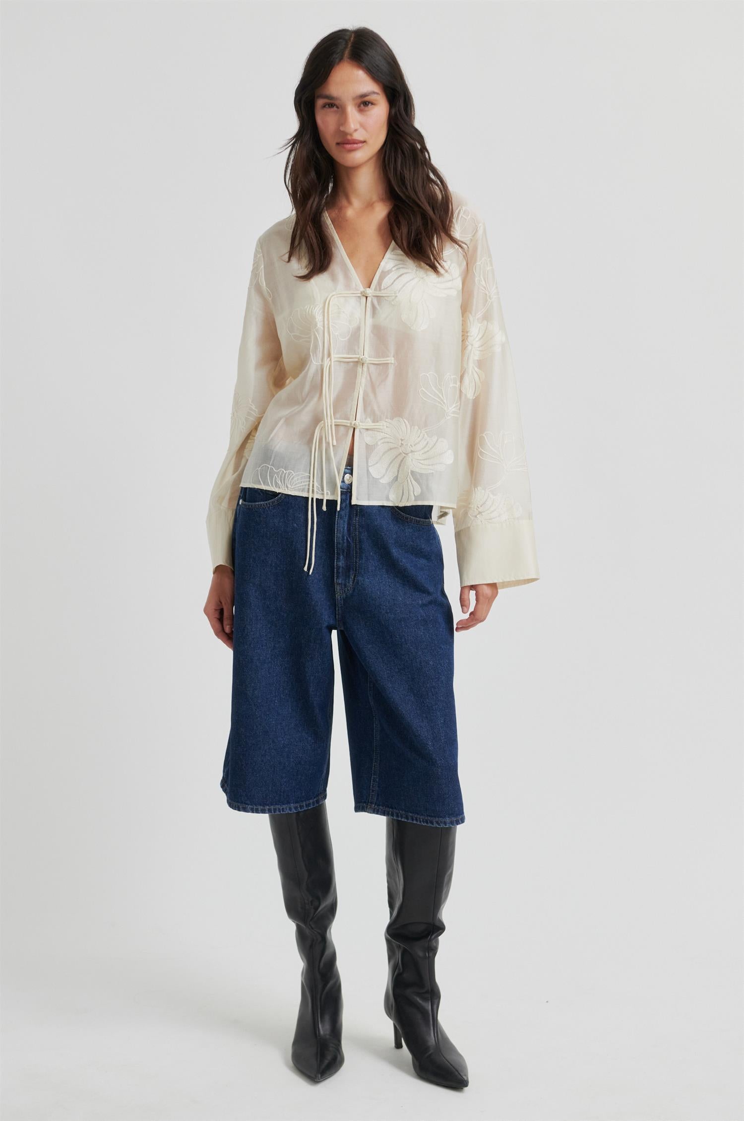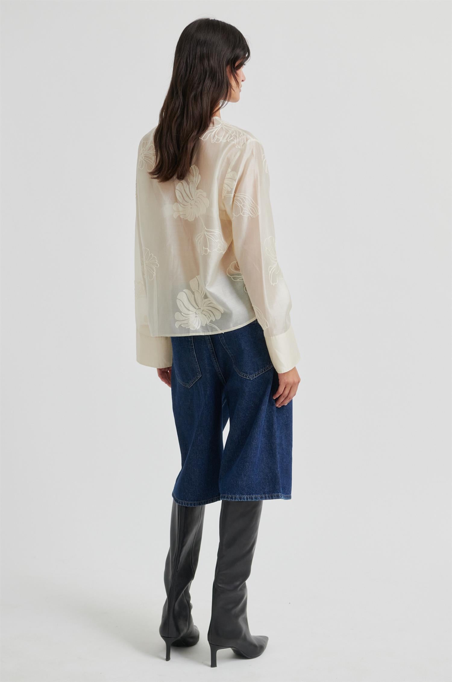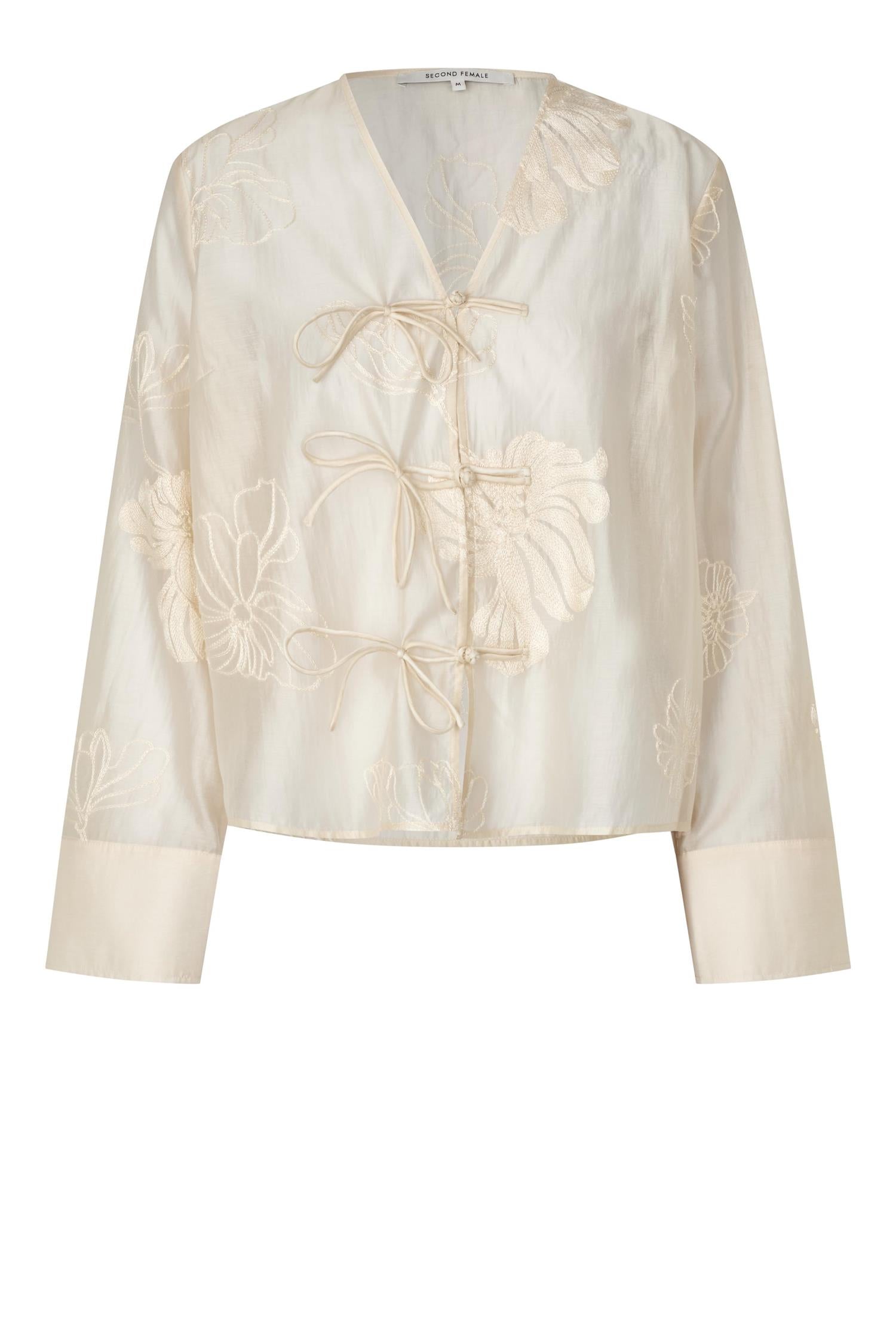 Vira Shirt fra Second Female. Vira Shirt er en lett og feminin skjorte i en delikat, semitransparent kvalitet med ton-i-ton broderier. Designet har V-hals med dekorativ hektelukking og lange ermer med brede mansjetter som gir et moderne uttrykk. Den vide passformen gir en avslappet og luftig silhuett. Normal i størrelsen.