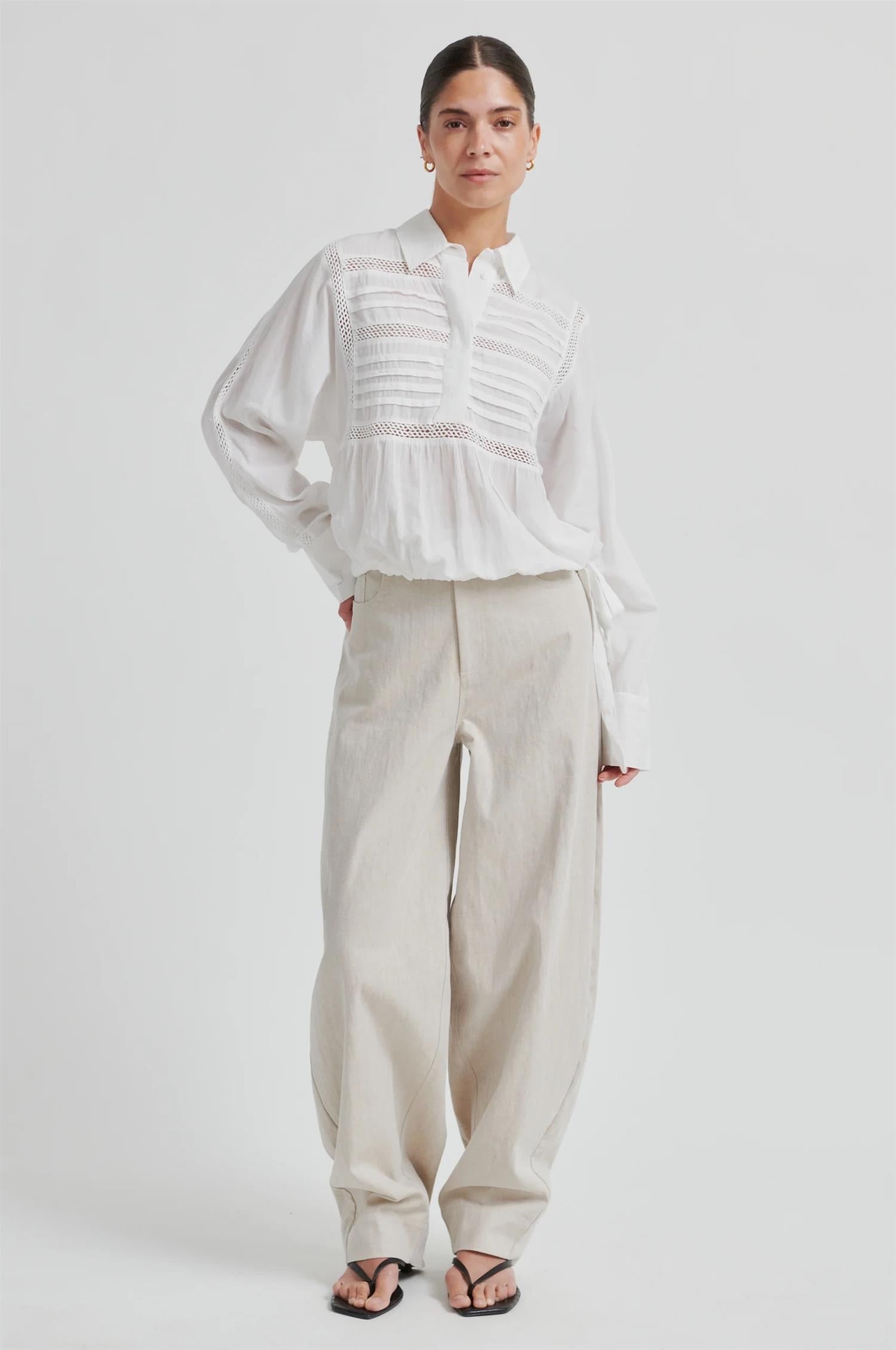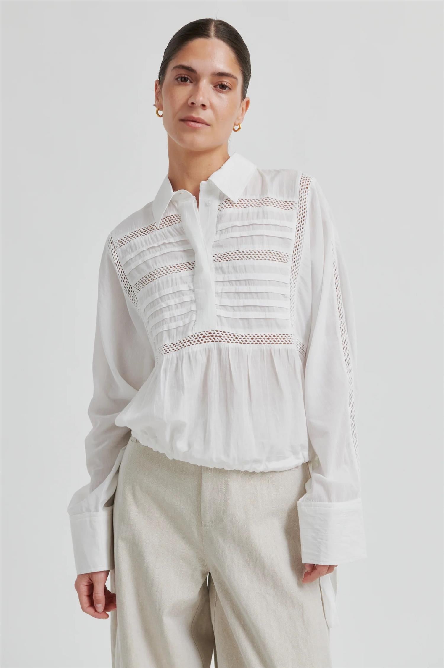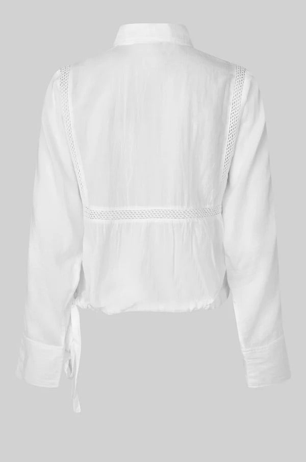 Martha Blouse fra Second Female. Martha Blouse er en feminin bluse med dekorative lace-detaljer. Blusen er laget i en myk bomullsblanding og har krage med halv knappestolpe og skjulte knapper foran. Den har mansjetter med knapper og justerbar snøring nederst, slik at passformen kan tilpasses. Løs og komfortabel passform. Normal i størrelsen.