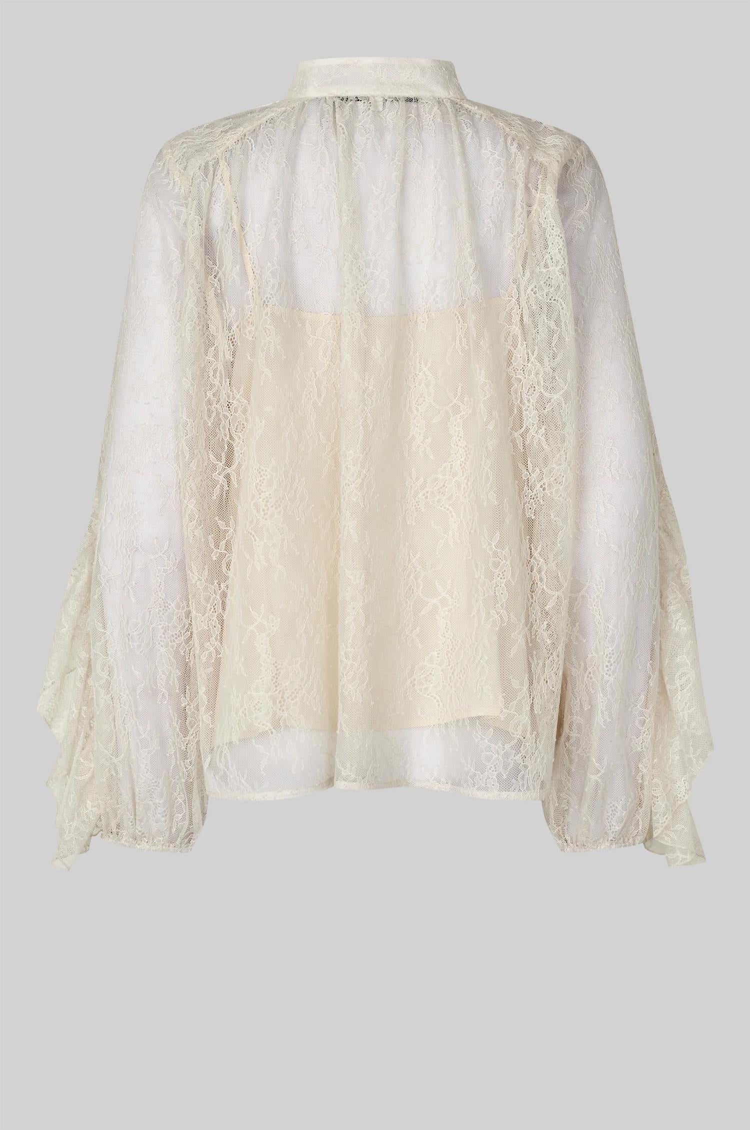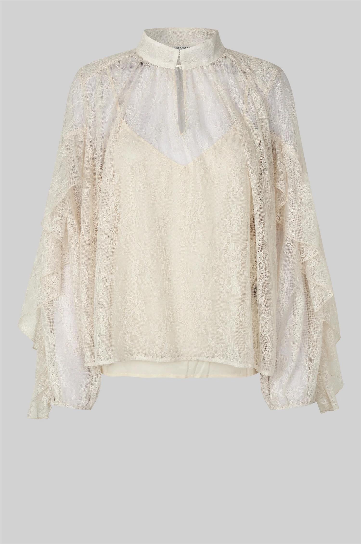Sybell Lace Blouse fra Second Female. Sybell Lace Blouse er en feminin bluse i delikat, transparent blondemønster. Blusen har knapper i front, vide ermer med dekorativ volangdetalj og elastiske mansjetter. Den kommer med en avtagbar undertopp i matchende tone for komfort og dekning. Normal passform.