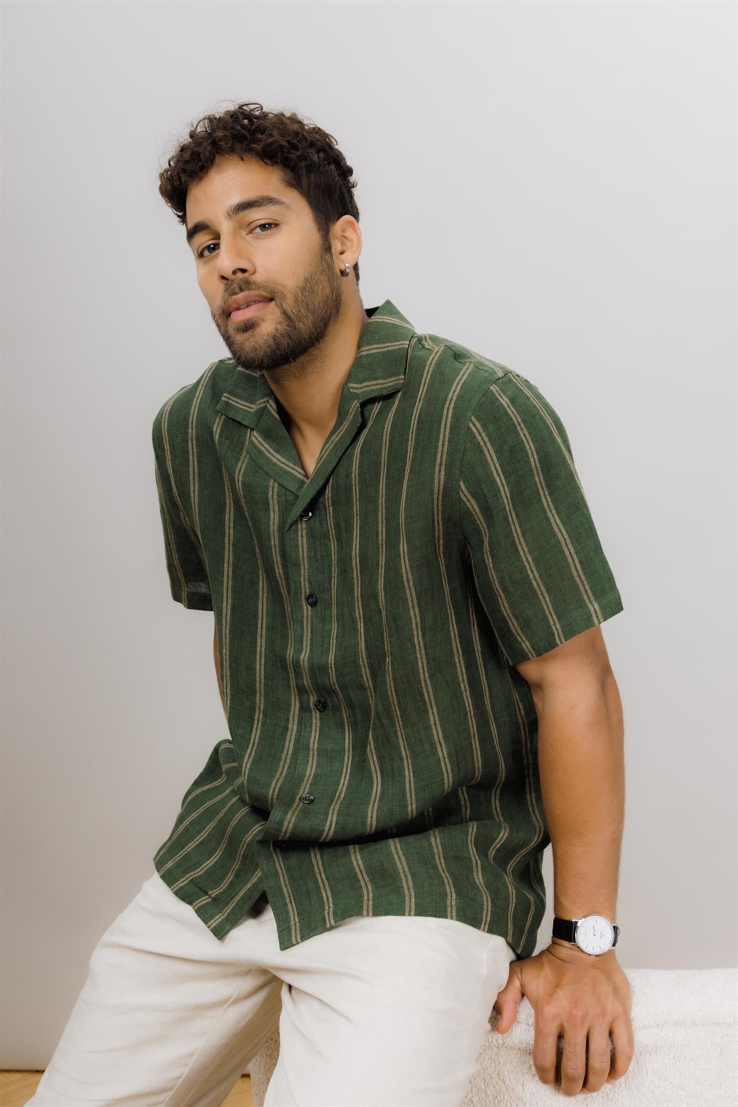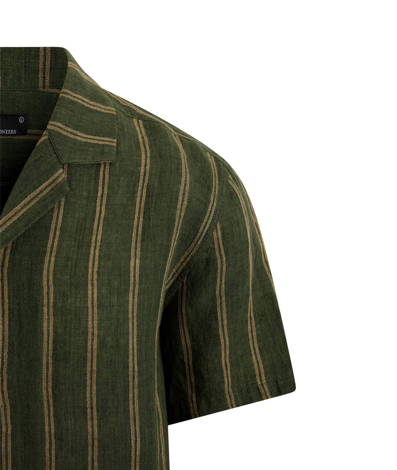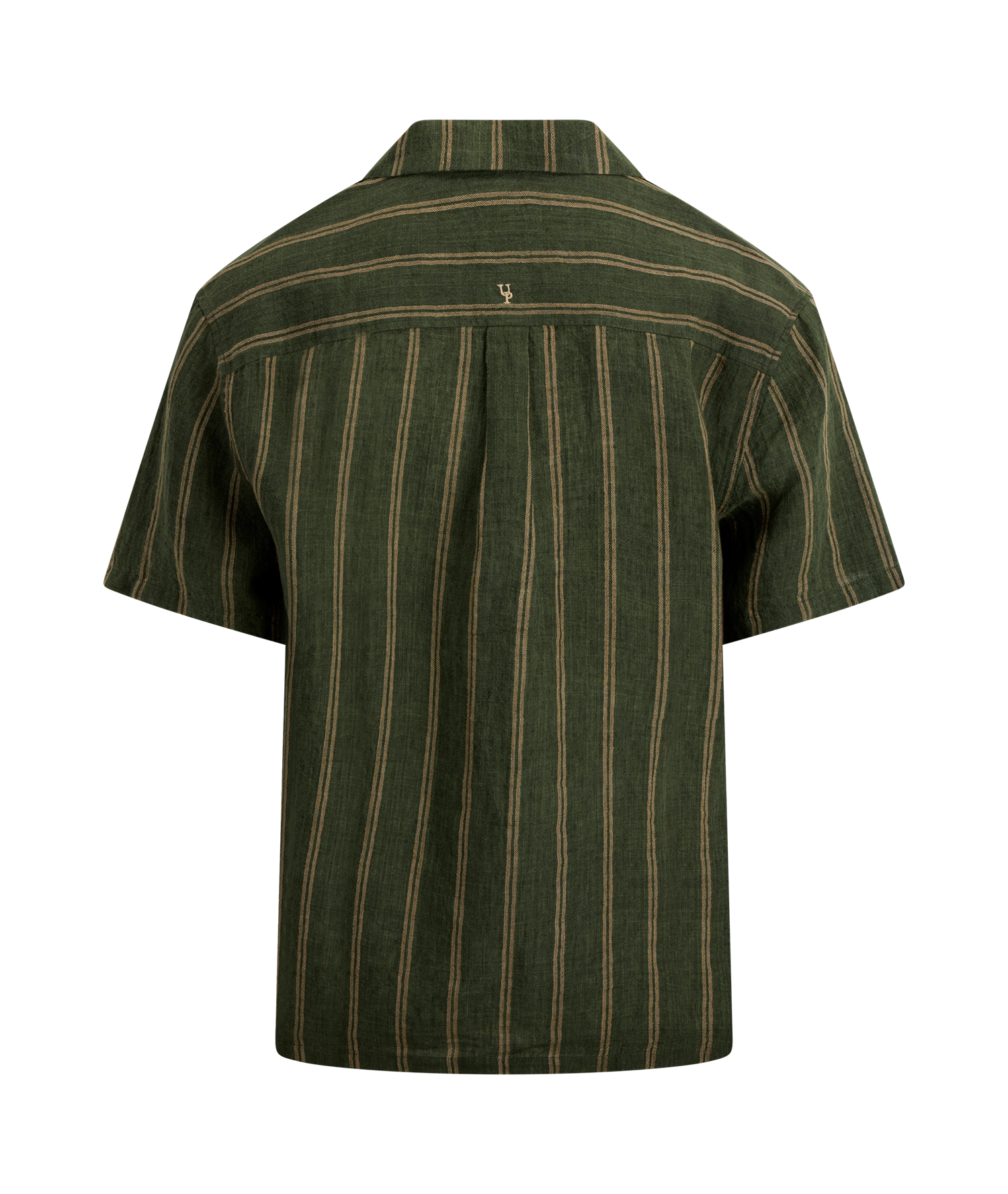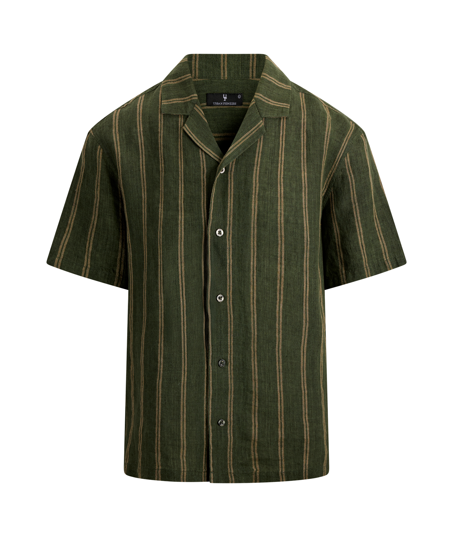 Ronaldo SS Shirt fra Urban Pioneers. Ronaldo SS Shirt er en kortermet skjorte i en dyp olivengrønn tone med subtile vertikale striper som gir et avslappet, men gjennomført uttrykk. Designet har klassisk krage og knappelukking i front, og den lette linkvaliteten gir en luftig følelse som passer perfekt på varme dager.