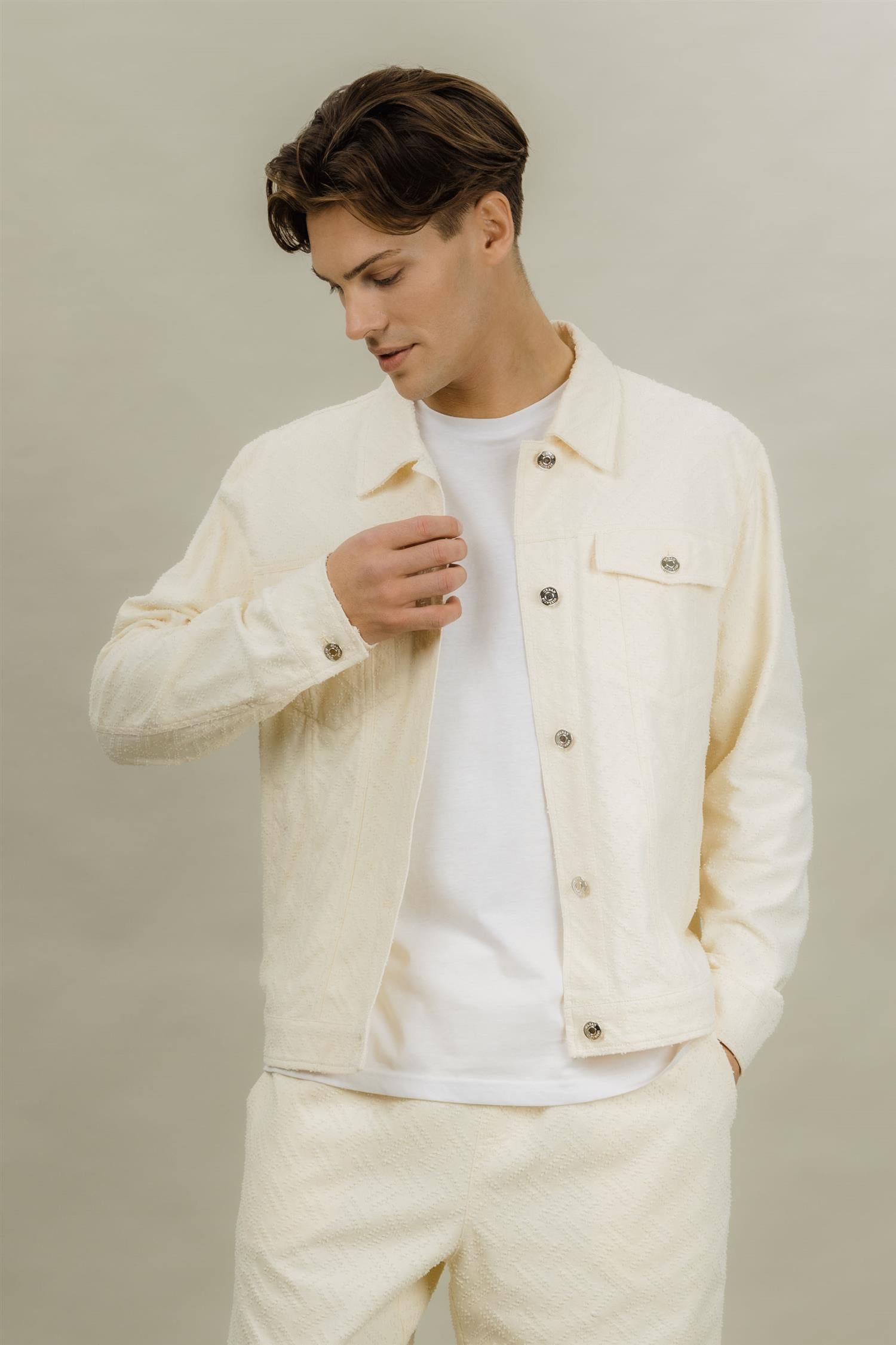 Robin Jacket fra Urban Pioneers. Robin Jacket er en stilren jakke med et moderne og raffinert uttrykk. Designet har klassisk krage, knappelukking og brystlommer som gir et tidløst preg. Den strukturerte overflaten tilfører dybde til plagget, mens den avslappede passformen gjør den enkel å style til både hverdags og mer gjennomførte antrekk.