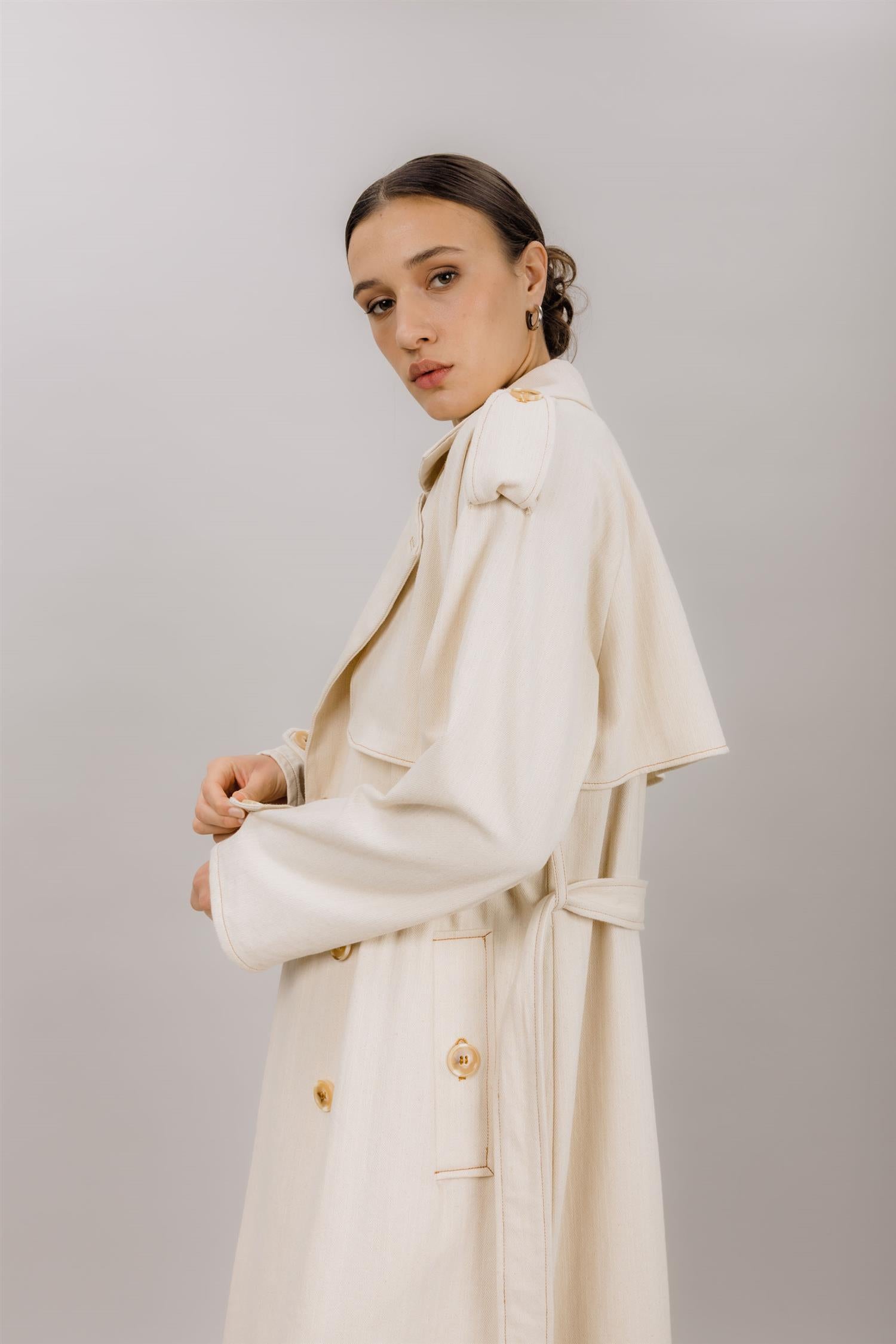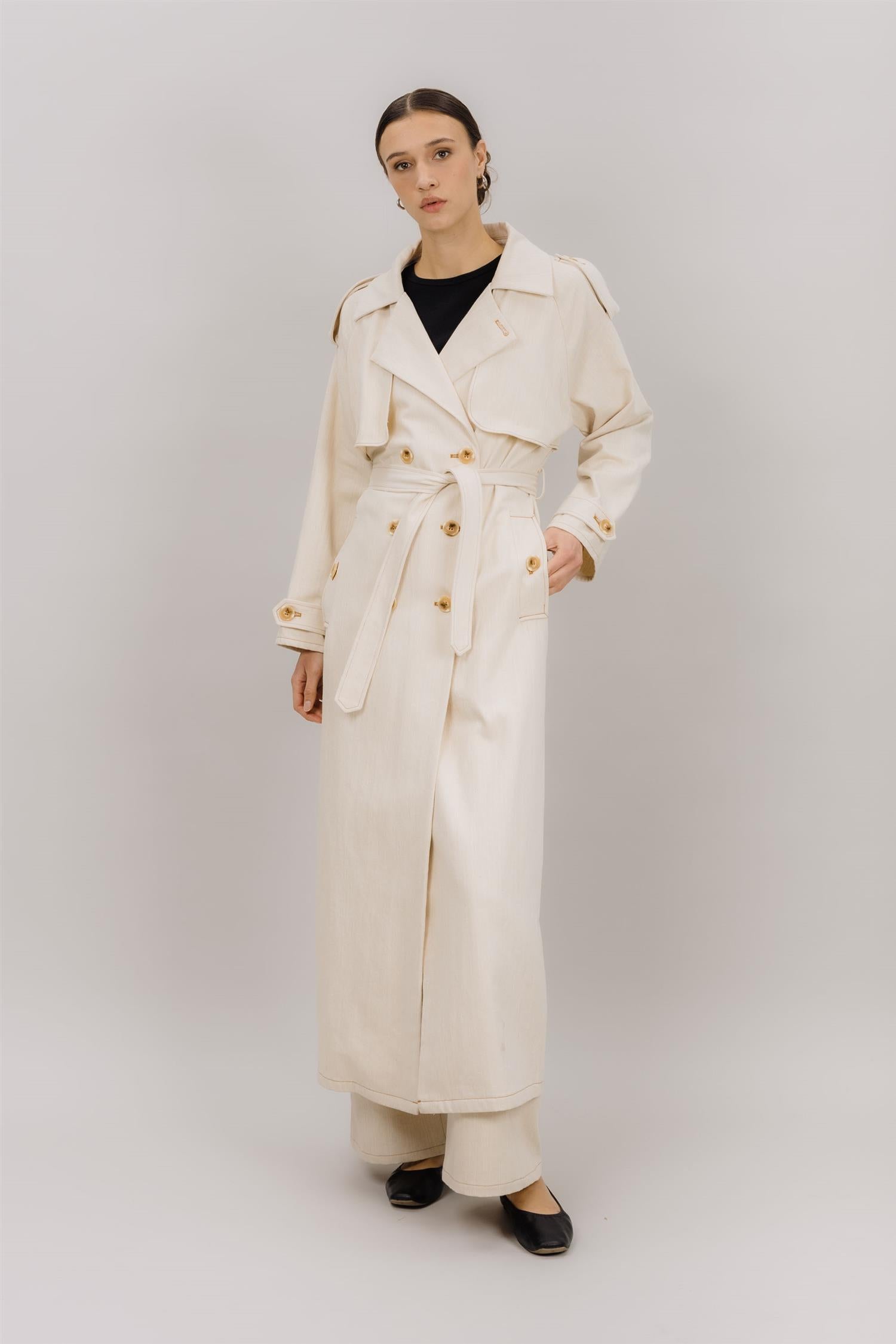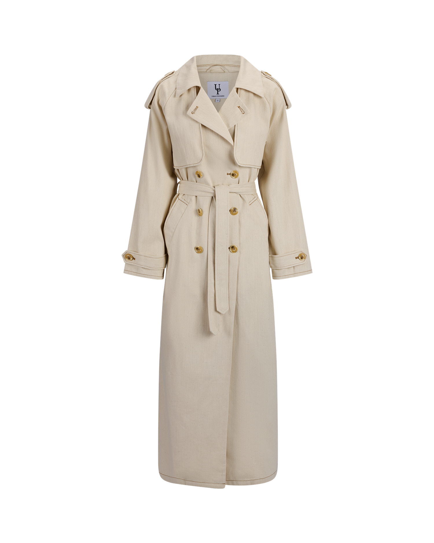 Alia Trenchcoat fra Urban Pioneers. Alia Trenchcoat er en klassisk og stilren trench i en lys kremfarget nyanse med et tidløst uttrykk. Designet har en lengre silhuett med dobbeltspent lukking, belte i midjen og markerte detaljer som gir et gjennomført og anvendelig preg. Et perfekt ytterplagg som løfter antrekket både til hverdag og mer oppkledde anledninger.