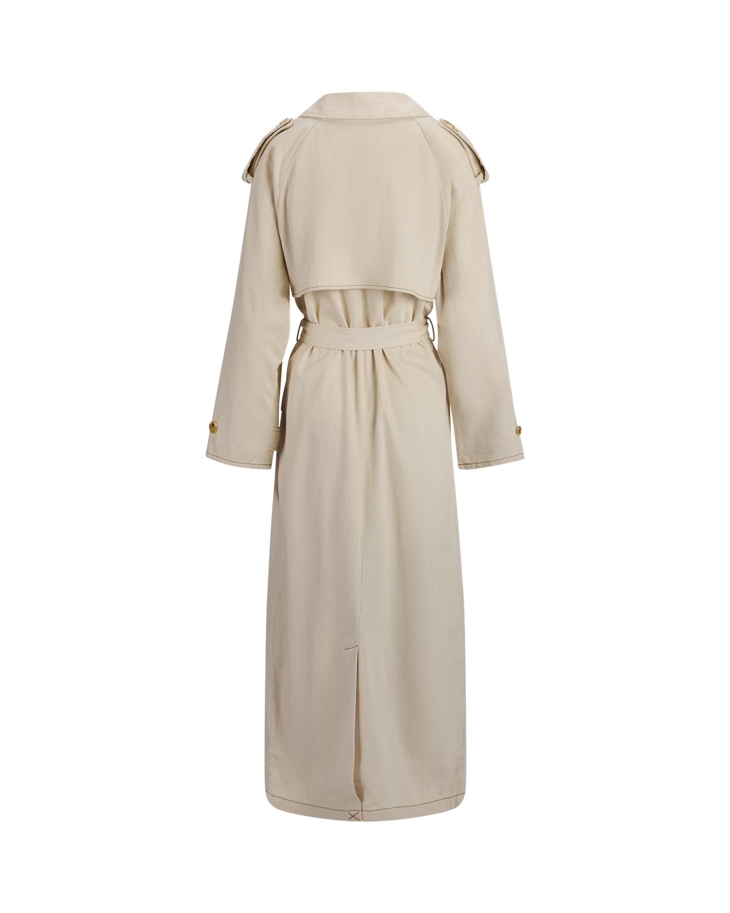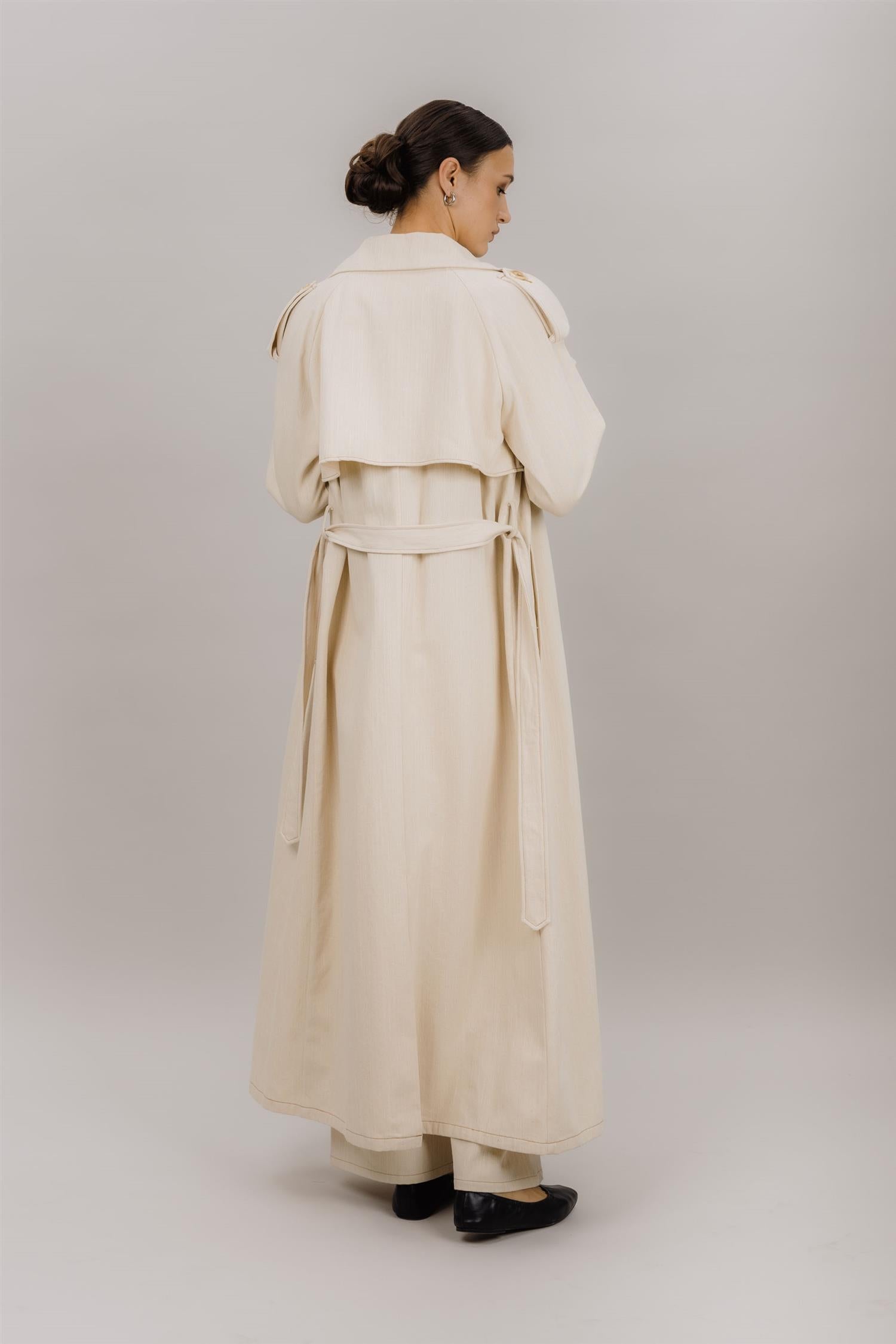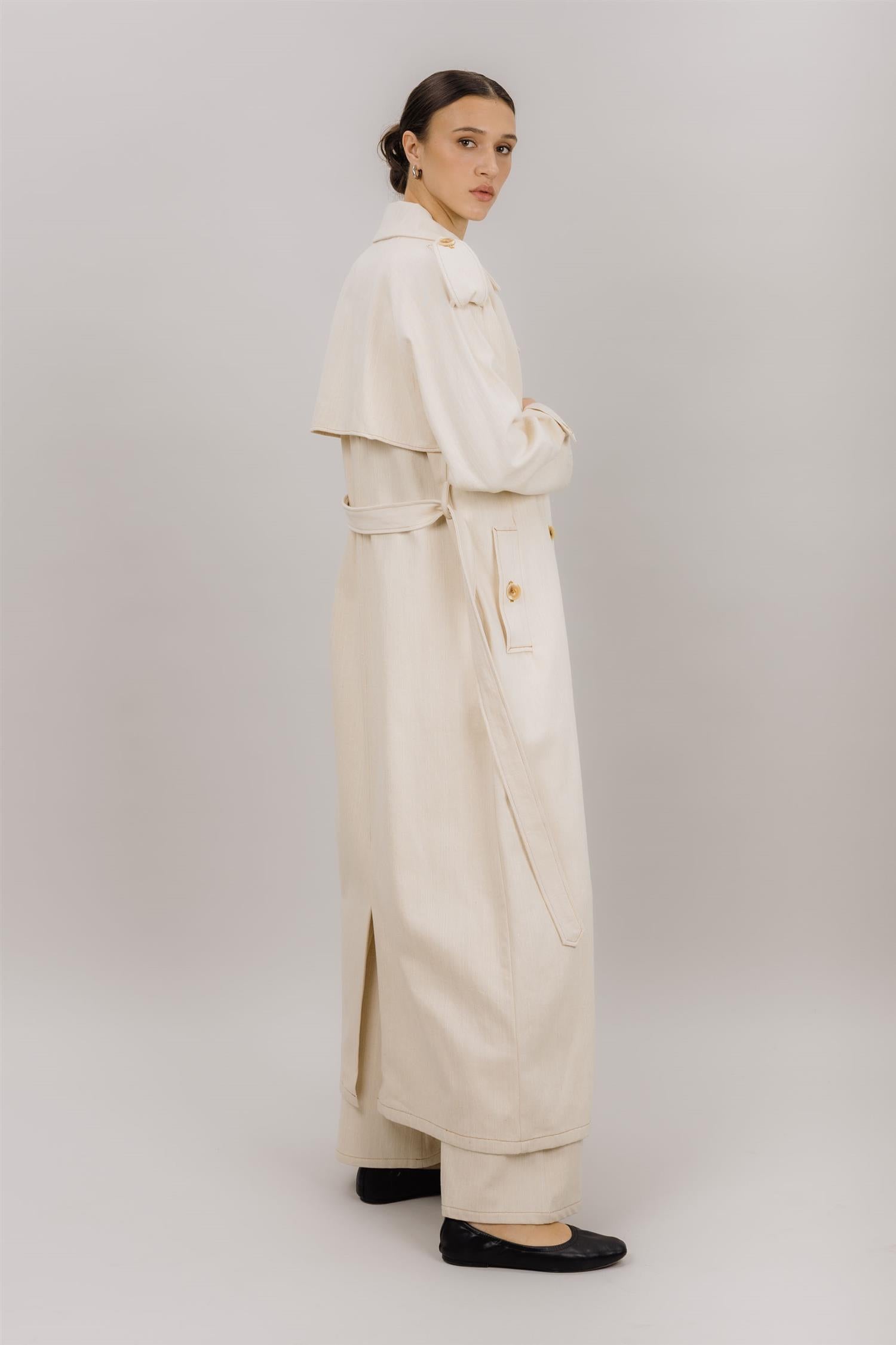 Alia Trenchcoat fra Urban Pioneers. Alia Trenchcoat er en klassisk og stilren trench i en lys kremfarget nyanse med et tidløst uttrykk. Designet har en lengre silhuett med dobbeltspent lukking, belte i midjen og markerte detaljer som gir et gjennomført og anvendelig preg. Et perfekt ytterplagg som løfter antrekket både til hverdag og mer oppkledde anledninger.
