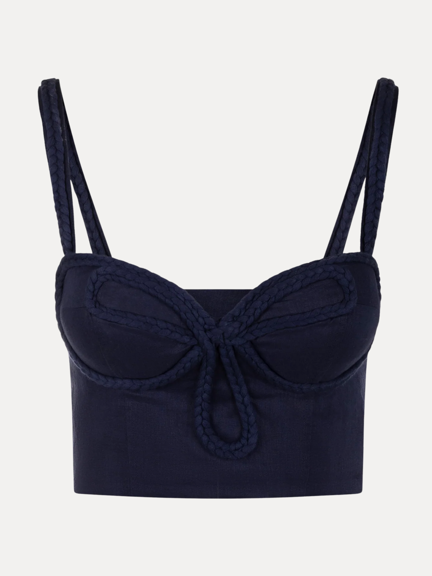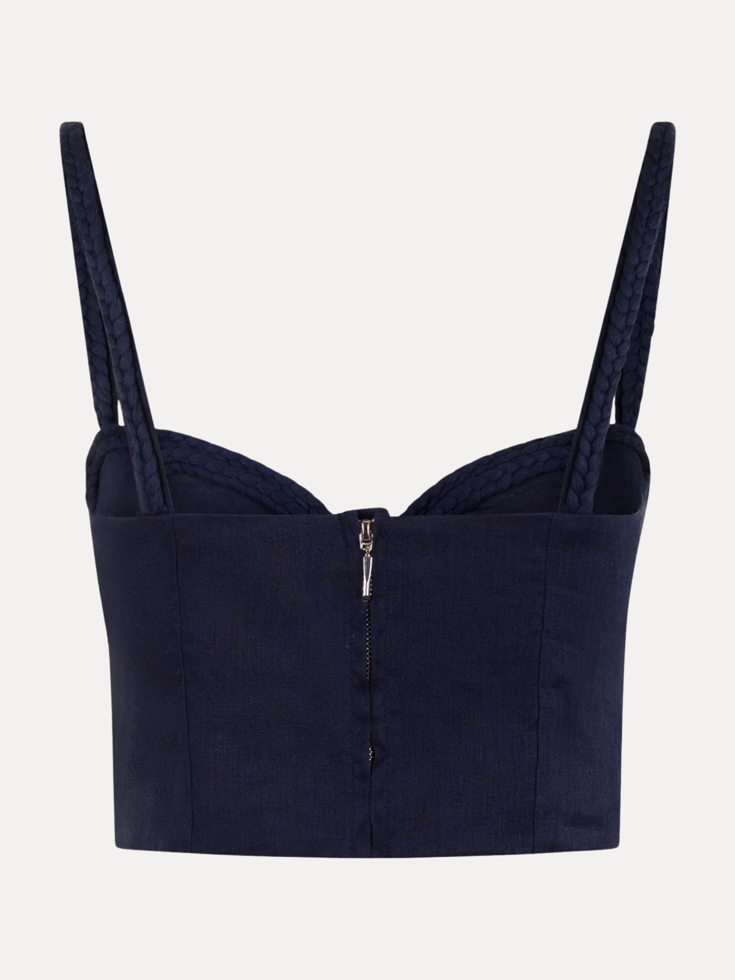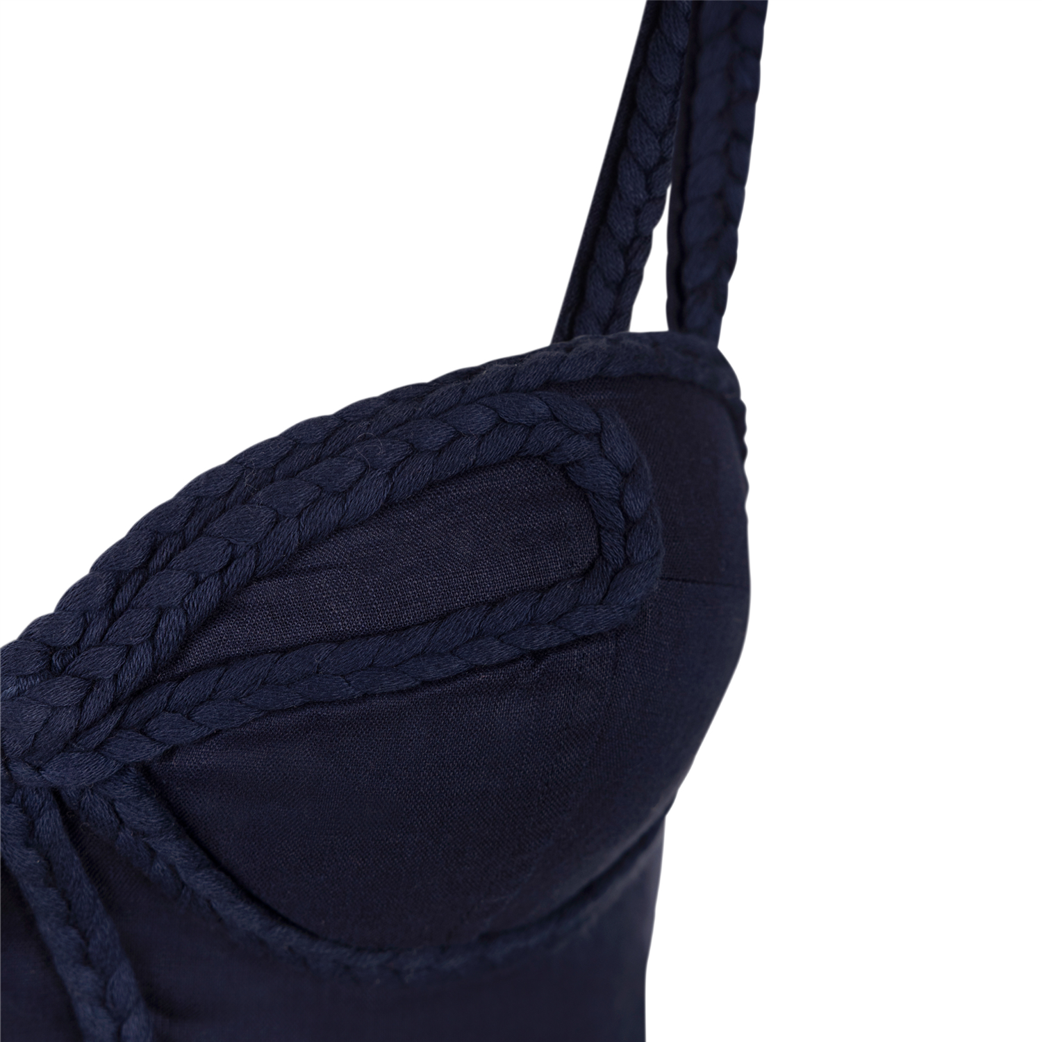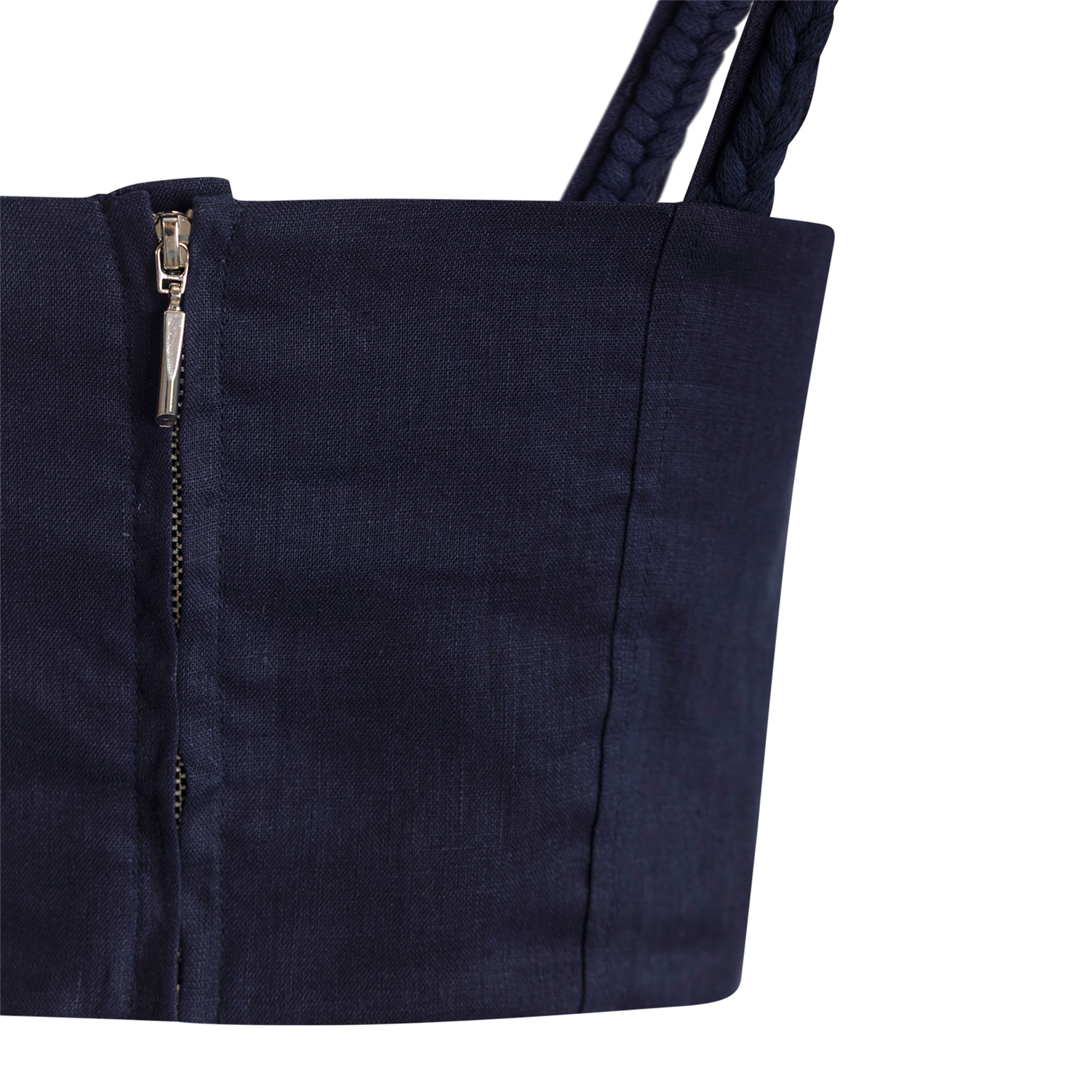 Zelmira Top fra Urban Pioneers Atelier. Zelmira Top er en feminin og karakteristisk topp i en dyp mørk marineblå nyanse. Designet har smale stropper og en figurnær silhuett, fremhevet av dekorative flettede detaljer som gir et unikt og gjennomført uttrykk. En lett og elegant topp som passer perfekt til varme dager og sommerlige antrekk.