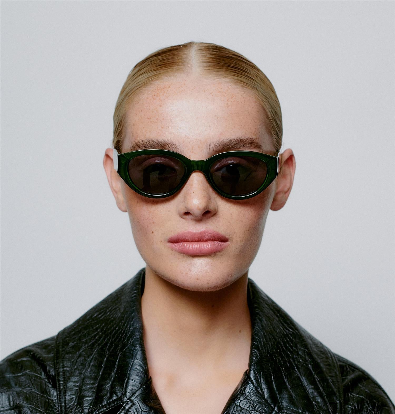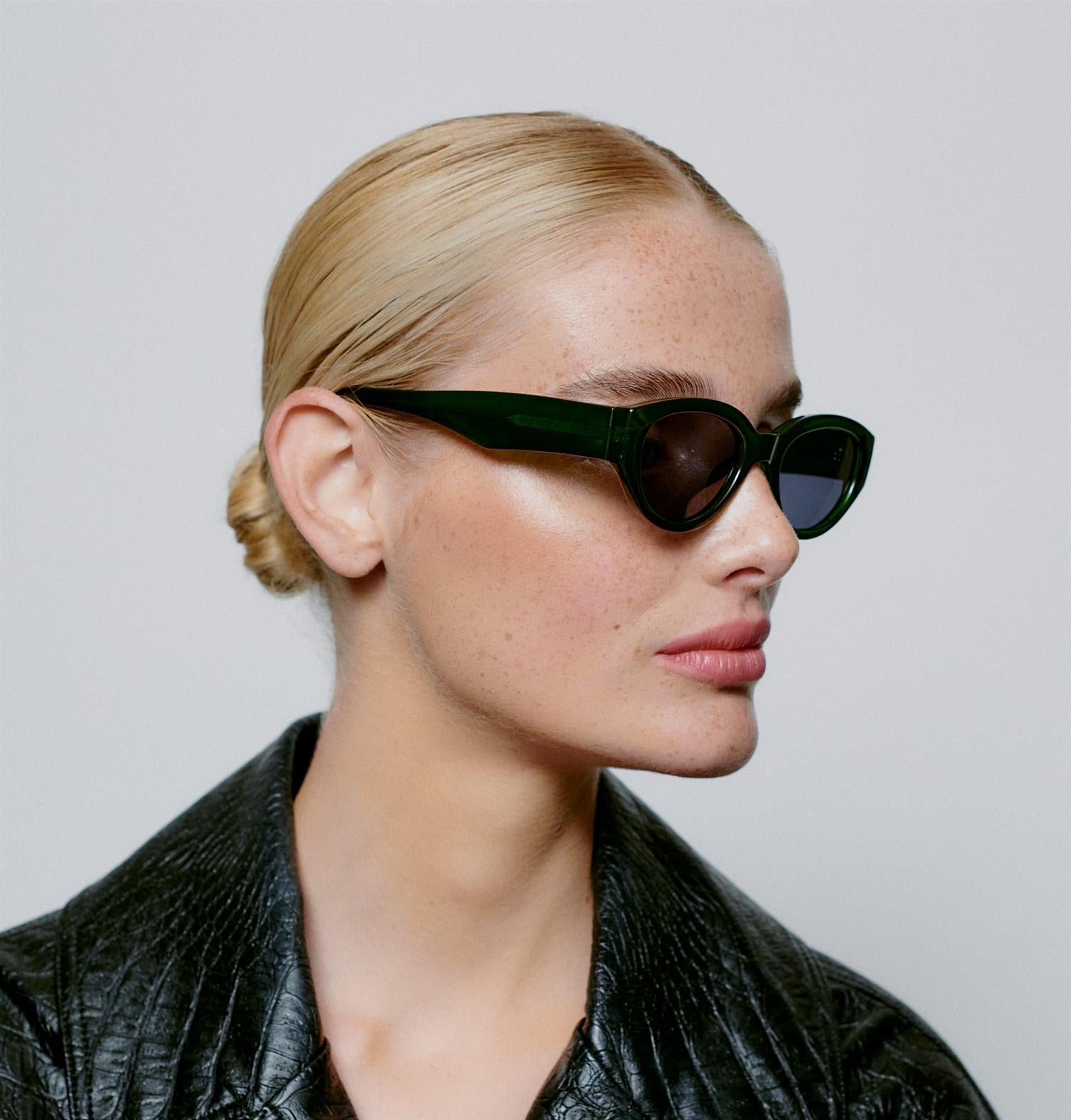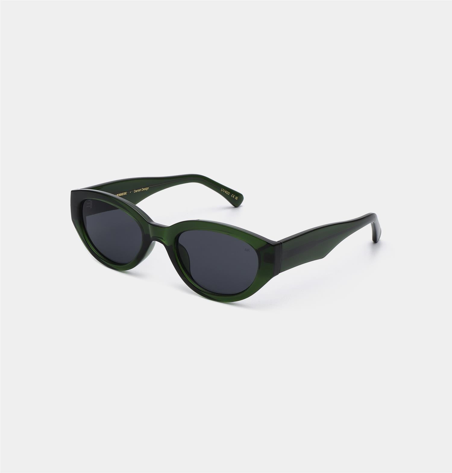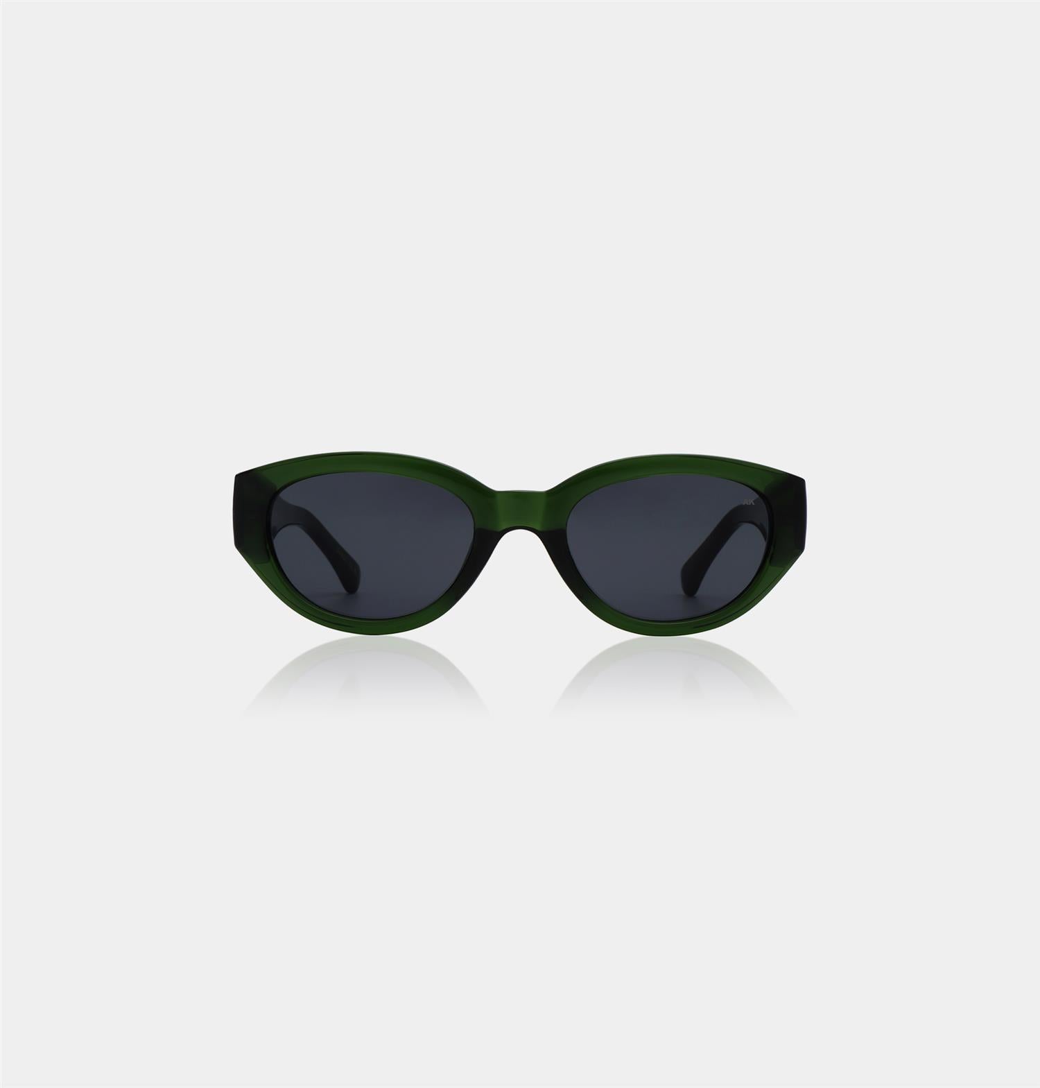 Winnie - Dark Green Transparent fra A.Kjærbede. Klassiske solbriller inspirert av moderne skandinaviske motetrender. Designet med ovale linser og en tung innfatning, gir den karakter og dristighet til ethvert utseende. Unisex.